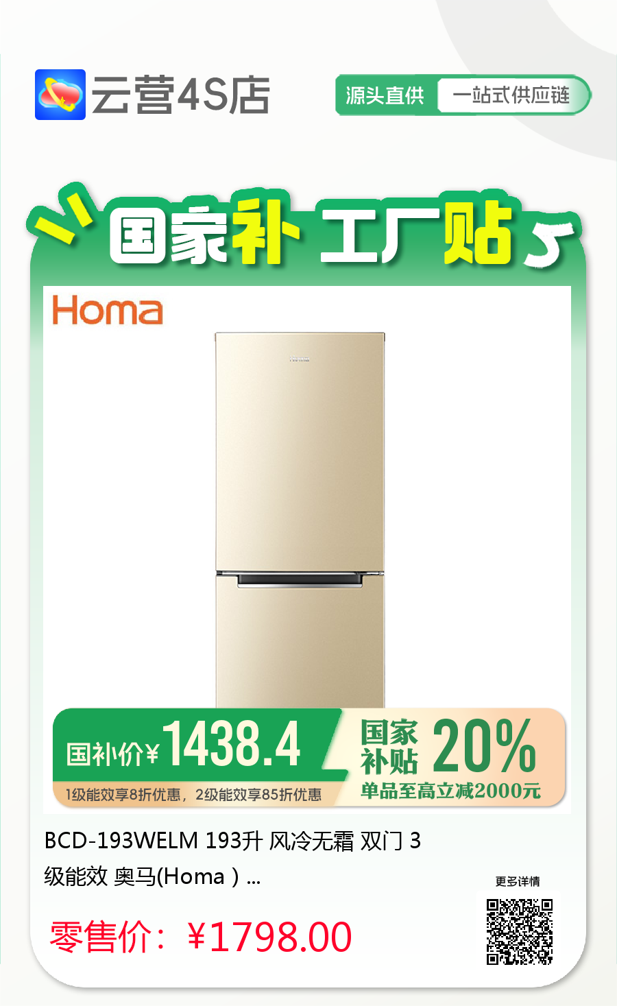 BCD-193WELM 193升 风冷无霜 双门 3级能效 奥马(Homa)