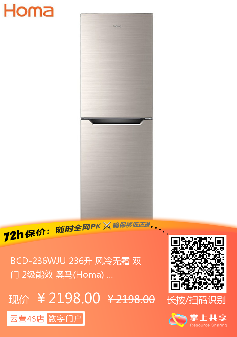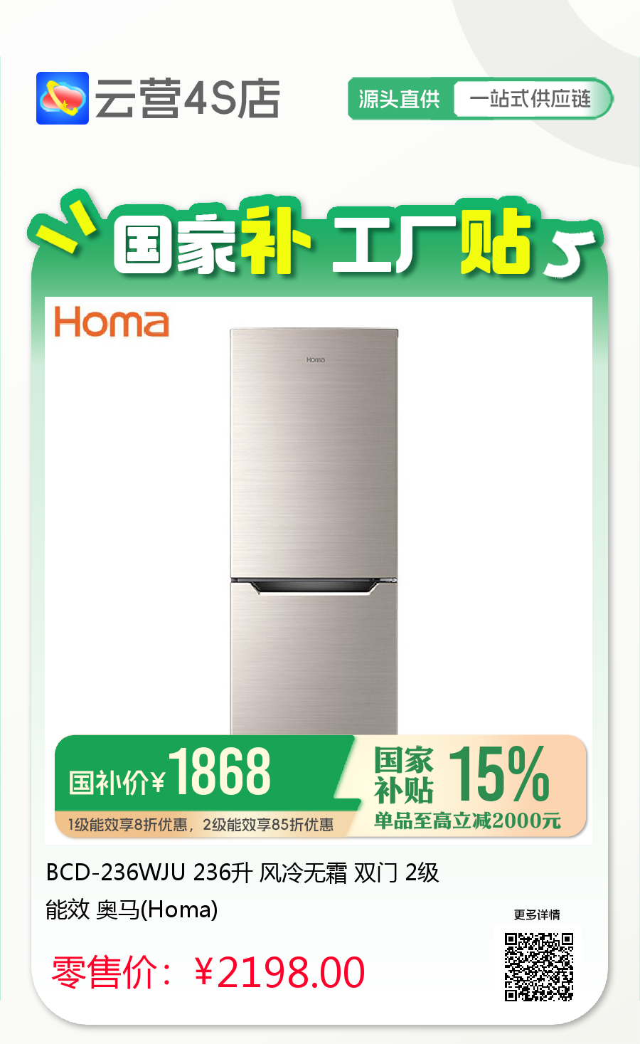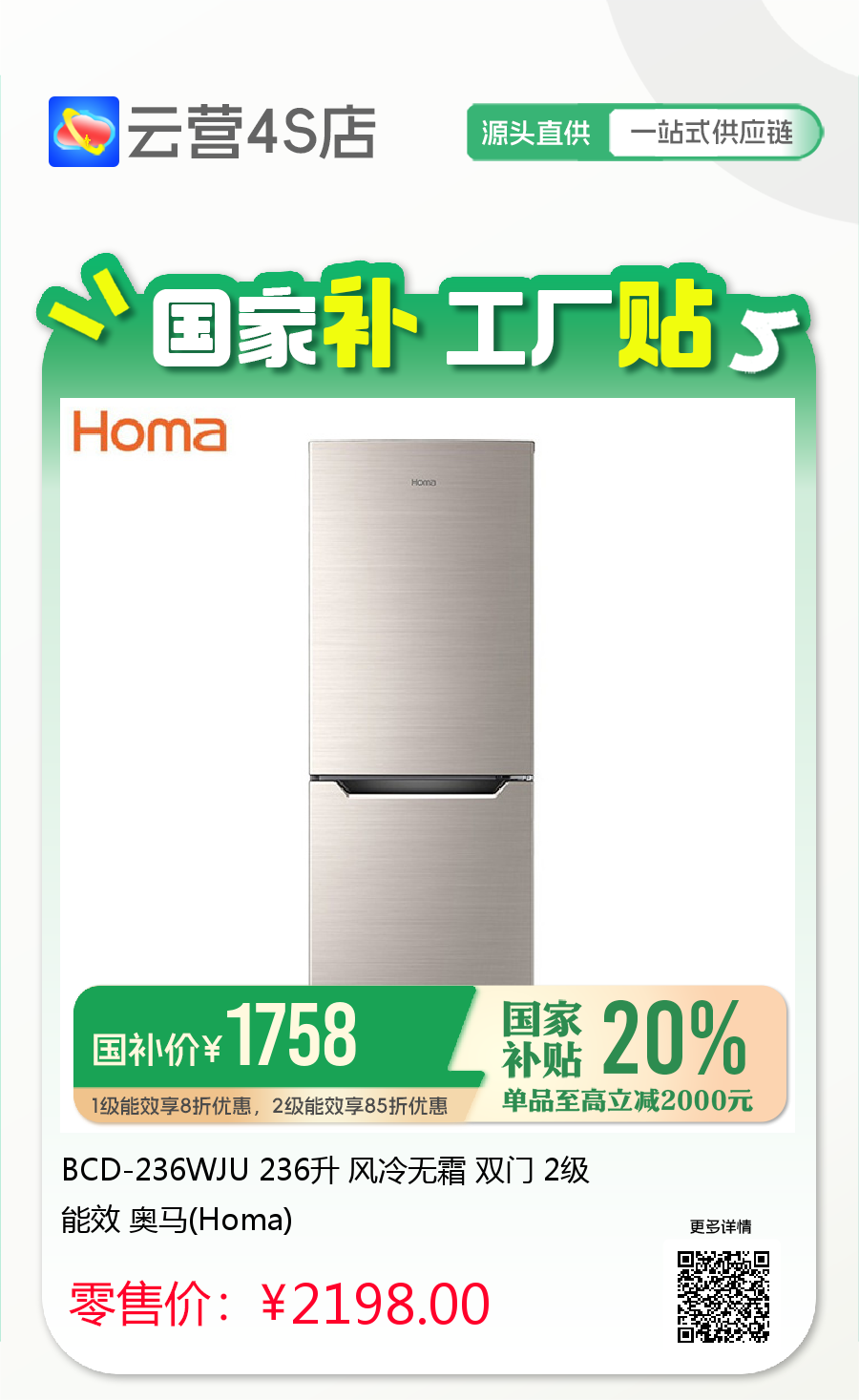 BCD-236WJU 236升 风冷无霜 双门 2级能效 奥马(Homa)