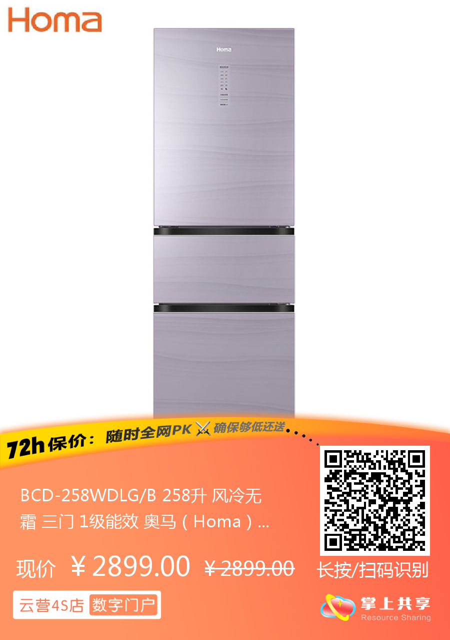 BCD-258WDLG/B 258升 风冷无霜 三门 1级能效 奥马(Homa)