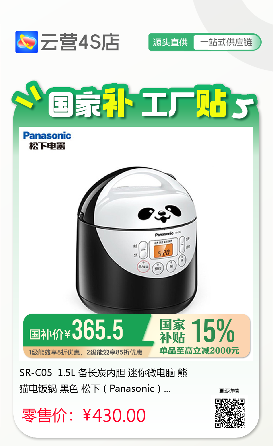 SR-C05 1.5L 备长炭内胆 迷你微电脑 熊猫电饭锅 黑色 松下(Panasonic)