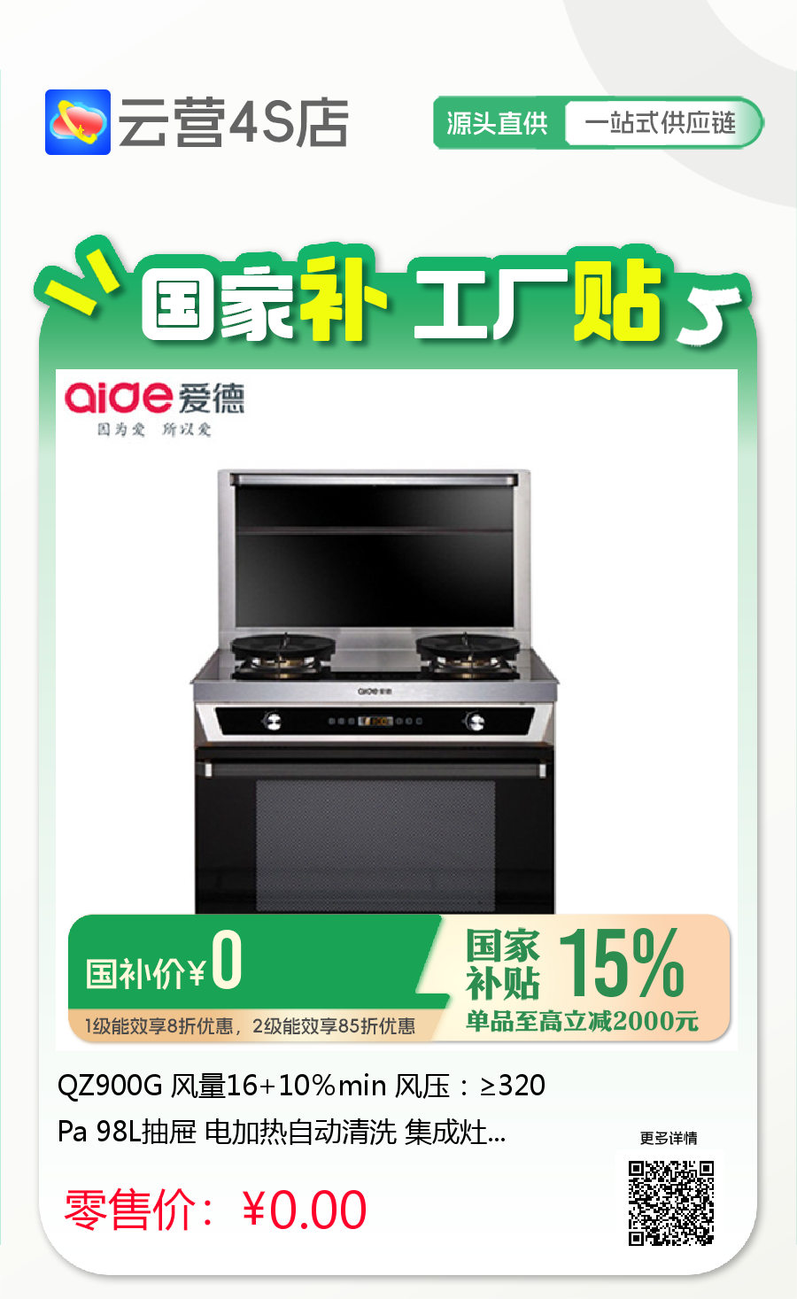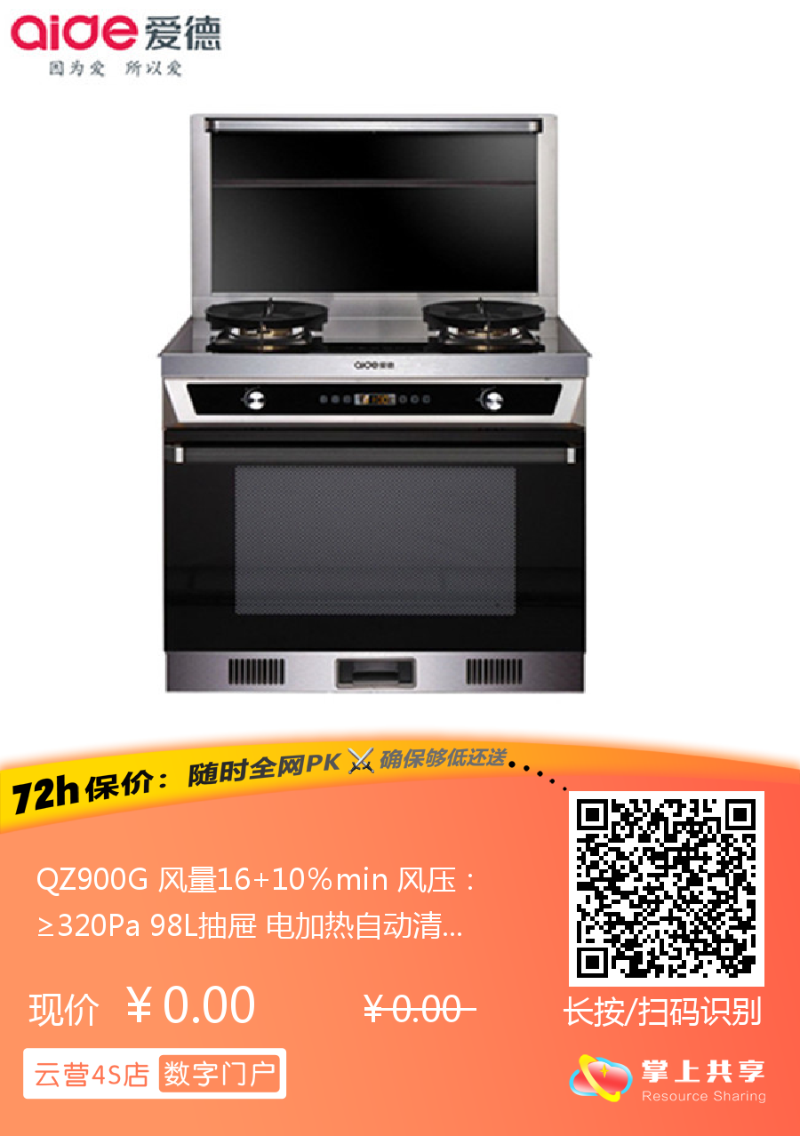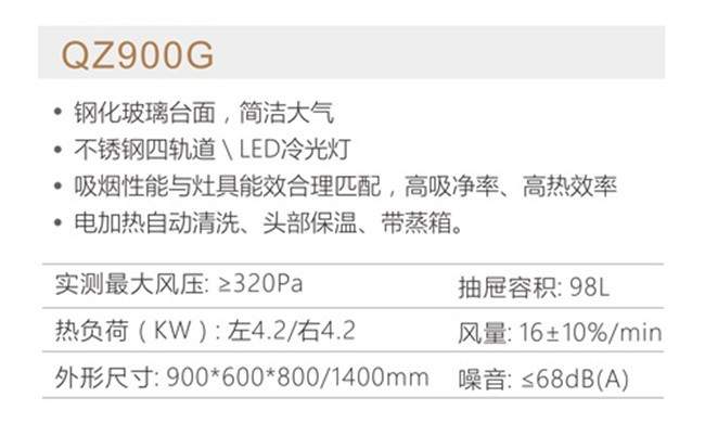 QZ900G 风量16+10%min 风压:≥320Pa 98L抽屉 电加热自动清洗 集成灶