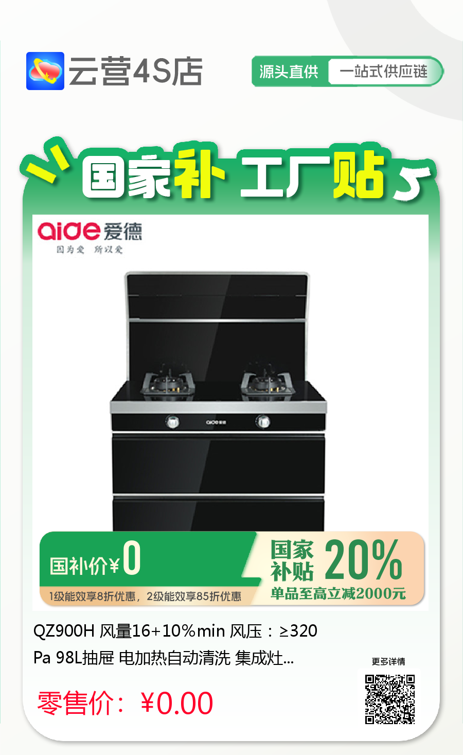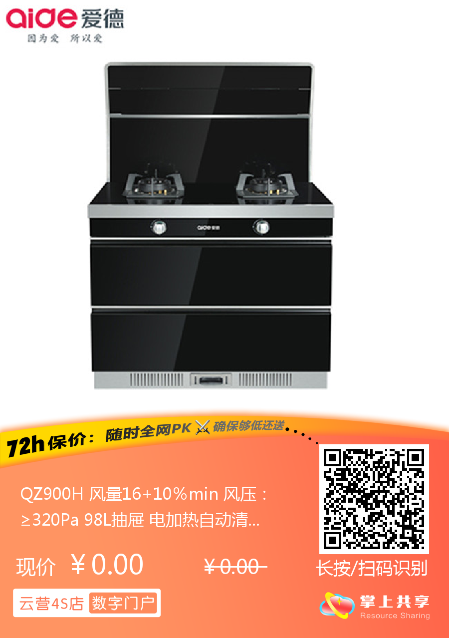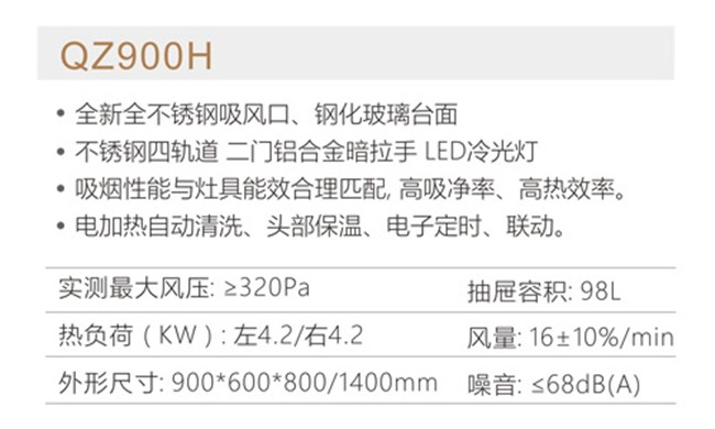 QZ900H 风量16+10%min 风压:≥320Pa 98L抽屉 电加热自动清洗 集成灶