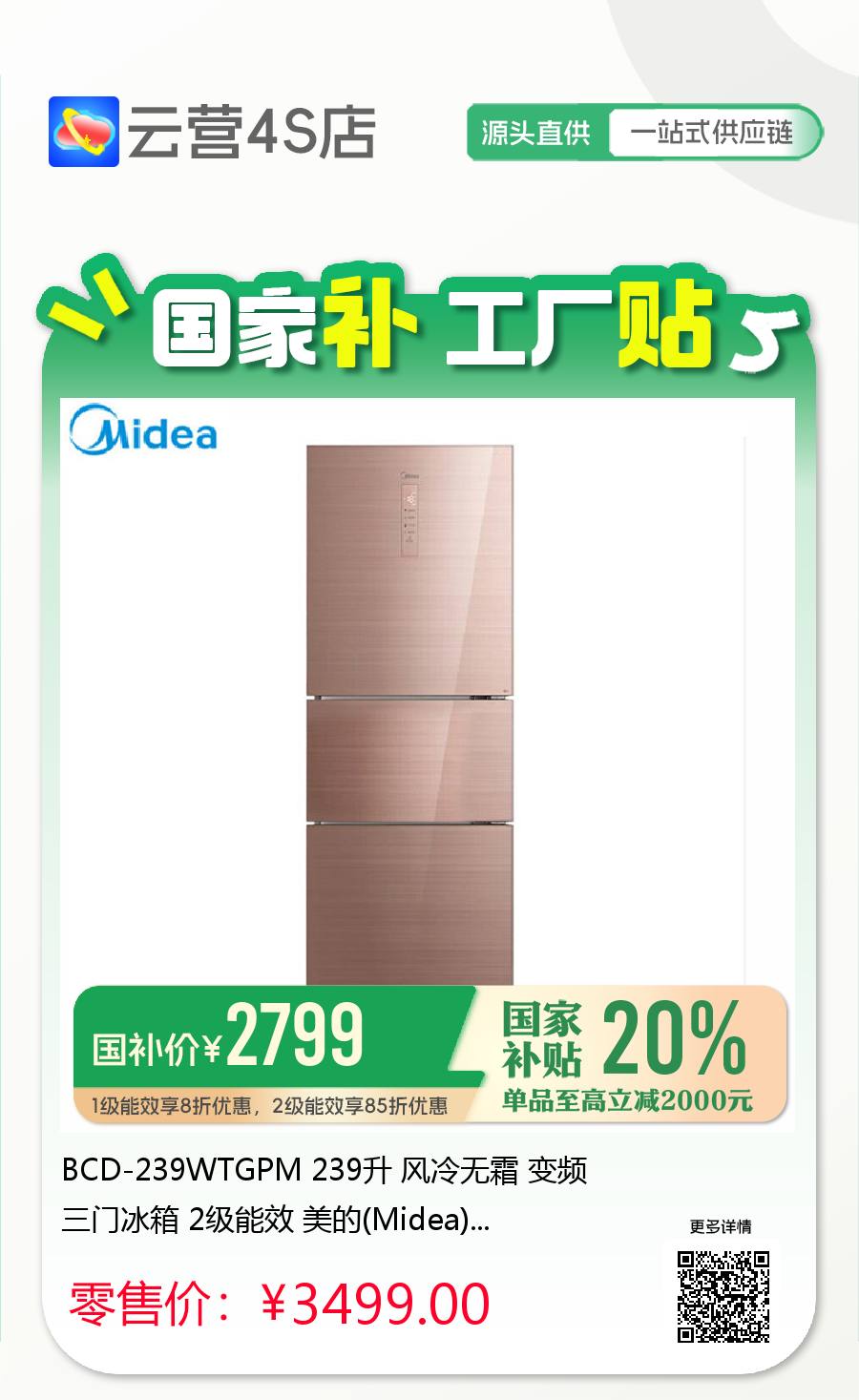 BCD-239WTGPM 239升 风冷无霜 变频 三门冰箱 2级能效 美的(Midea)