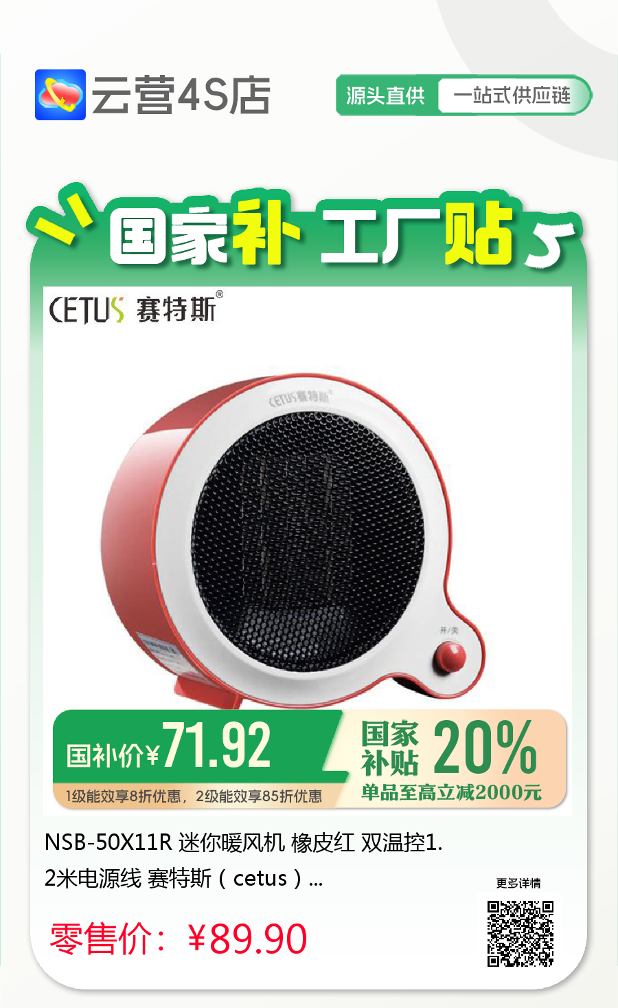NSB-50X11R 迷你暖风机 橡皮红 双温控1.2米电源线 赛特斯(cetus)