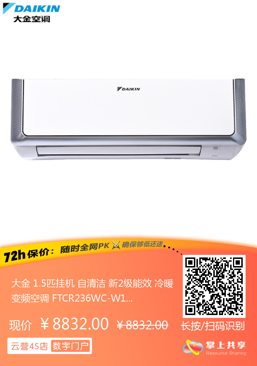 大金 1.5匹挂机 自清洁 新2级能效 冷暖变频空调 FTCR236WC-W1