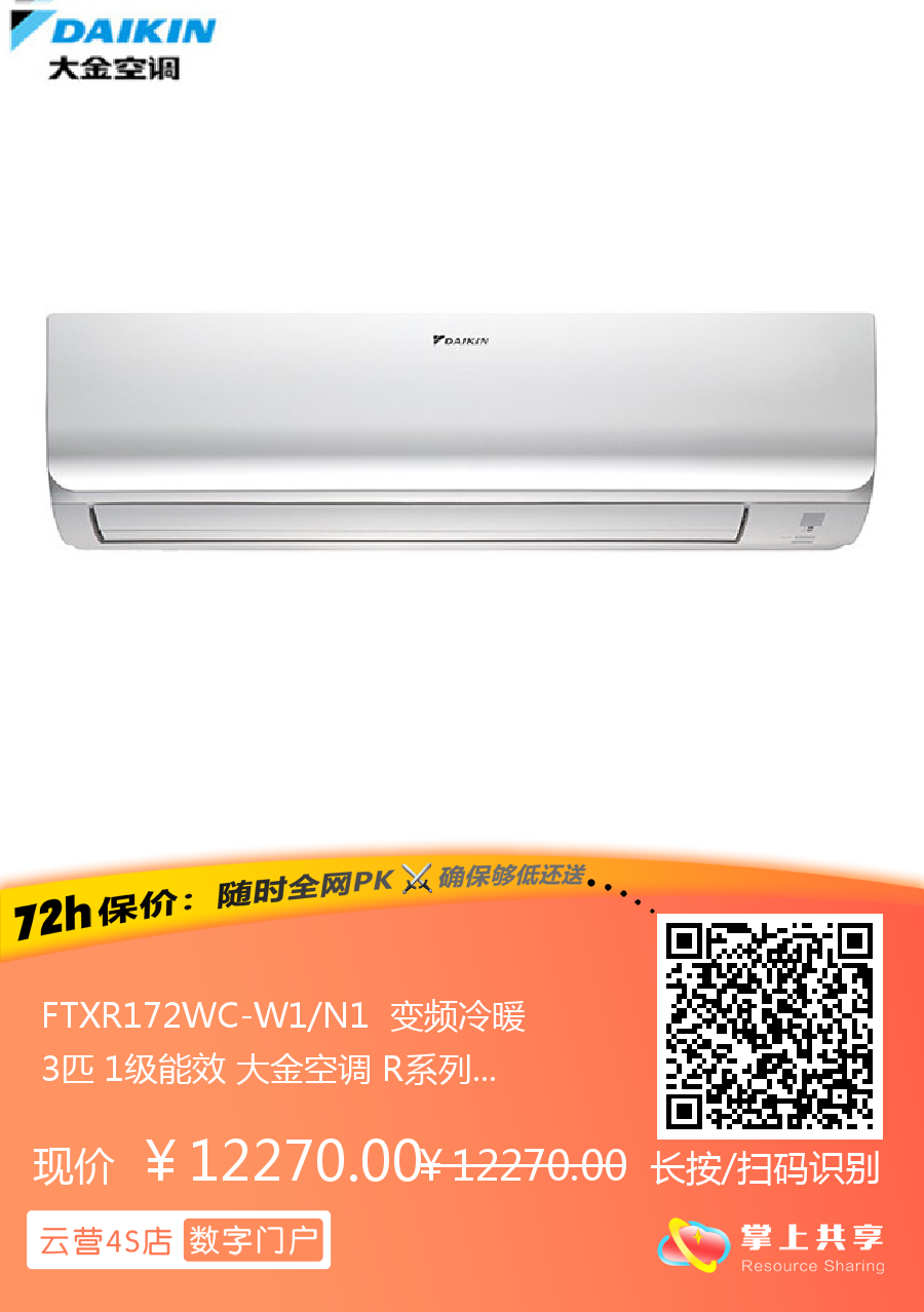 大金 3匹挂机 R 新1级能效 冷暖变频空调 FTXR172WC-W1/N1