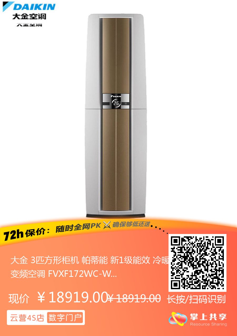 大金 3匹方形柜机 帕蒂能 新1级能效 冷暖变频空调 FVXF172WC-W