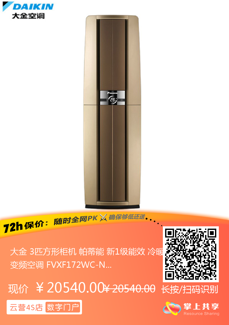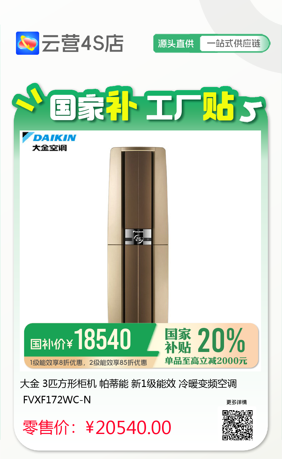 大金 3匹方形柜机 帕蒂能 新1级能效 冷暖变频空调 FVXF172WC-N