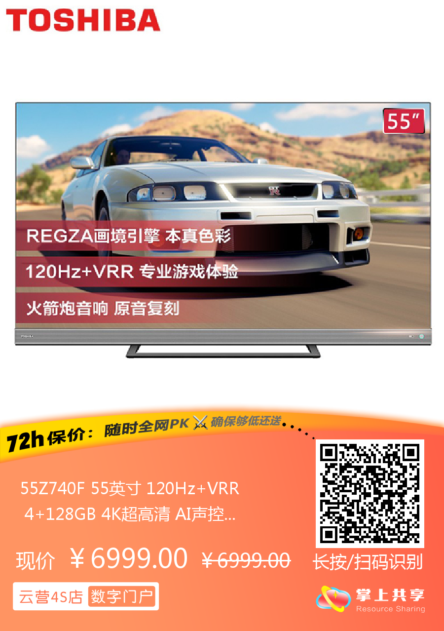 55Z740F 55英寸 120Hz+VRR 4+128GB 4K超高清 AI声控 HDMI2.1 火箭炮音响 游戏电视机 东芝(TOSHIBA)
