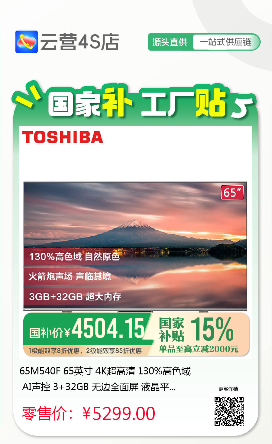 65M540F 65英寸 4K超高清 130%高色域 AI声控 3+32GB 无边全面屏 液晶平板电视机 东芝(TOSHIBA)