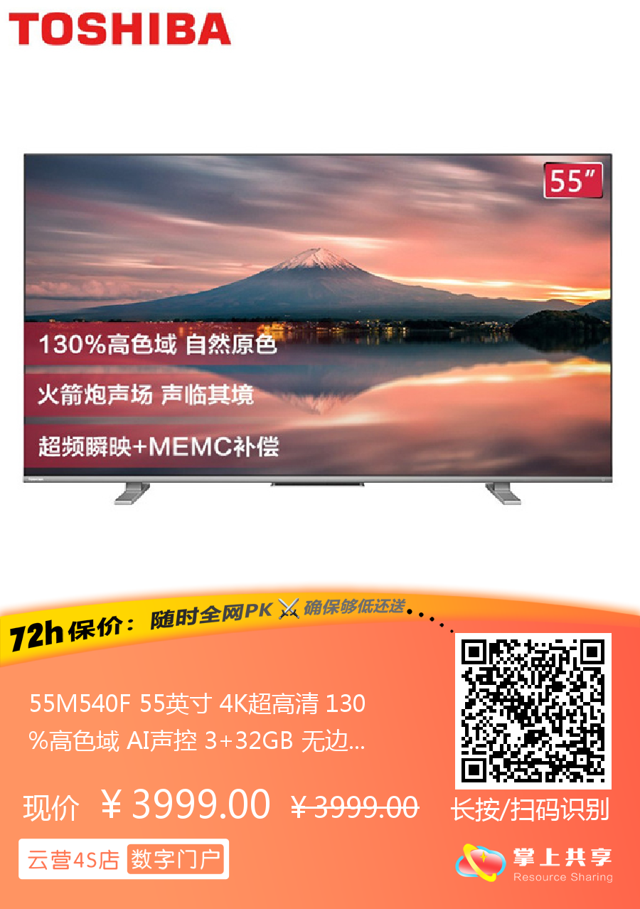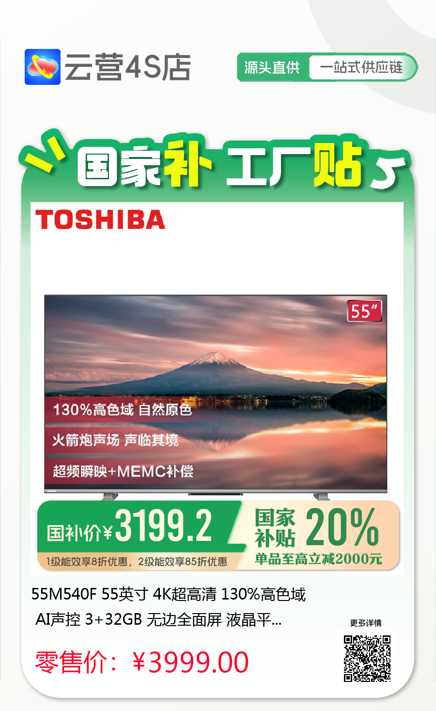 55M540F 55英寸 4K超高清 130%高色域 AI声控 3+32GB 无边全面屏 液晶平板电视机 东芝(TOSHIBA)