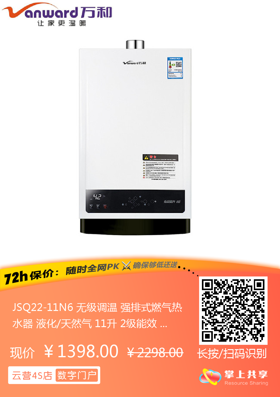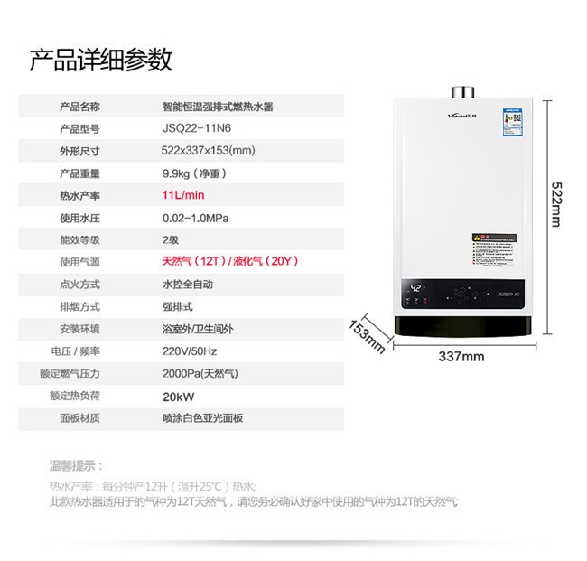 JSQ22-11N6 无级调温 强排式燃气热水器 液化/天然气 11升 2级能效 高光白