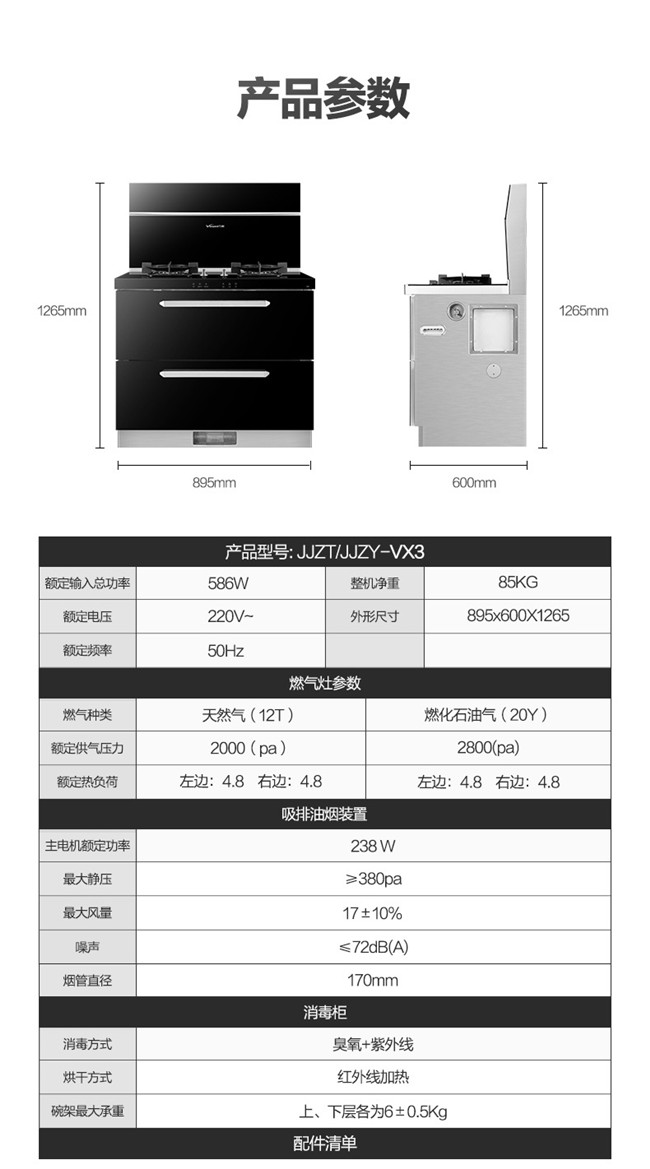 JJZT/JJZY-VX3 集成灶 抽油烟机 燃气灶具 消毒柜套装 1级能效