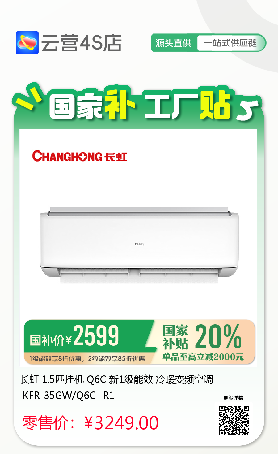长虹 1.5匹挂机 Q6C 新1级能效 冷暖变频空调 KFR-35GW/Q6C+R1