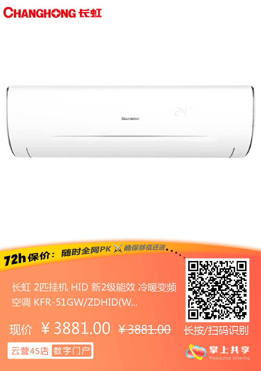 长虹 2匹挂机 HID 新2级能效 冷暖变频空调 KFR-51GW/ZDHID(W1-G)+R2