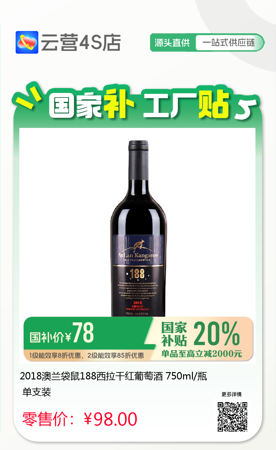 2018澳兰袋鼠188西拉干红葡萄酒 750ml/瓶 单支装