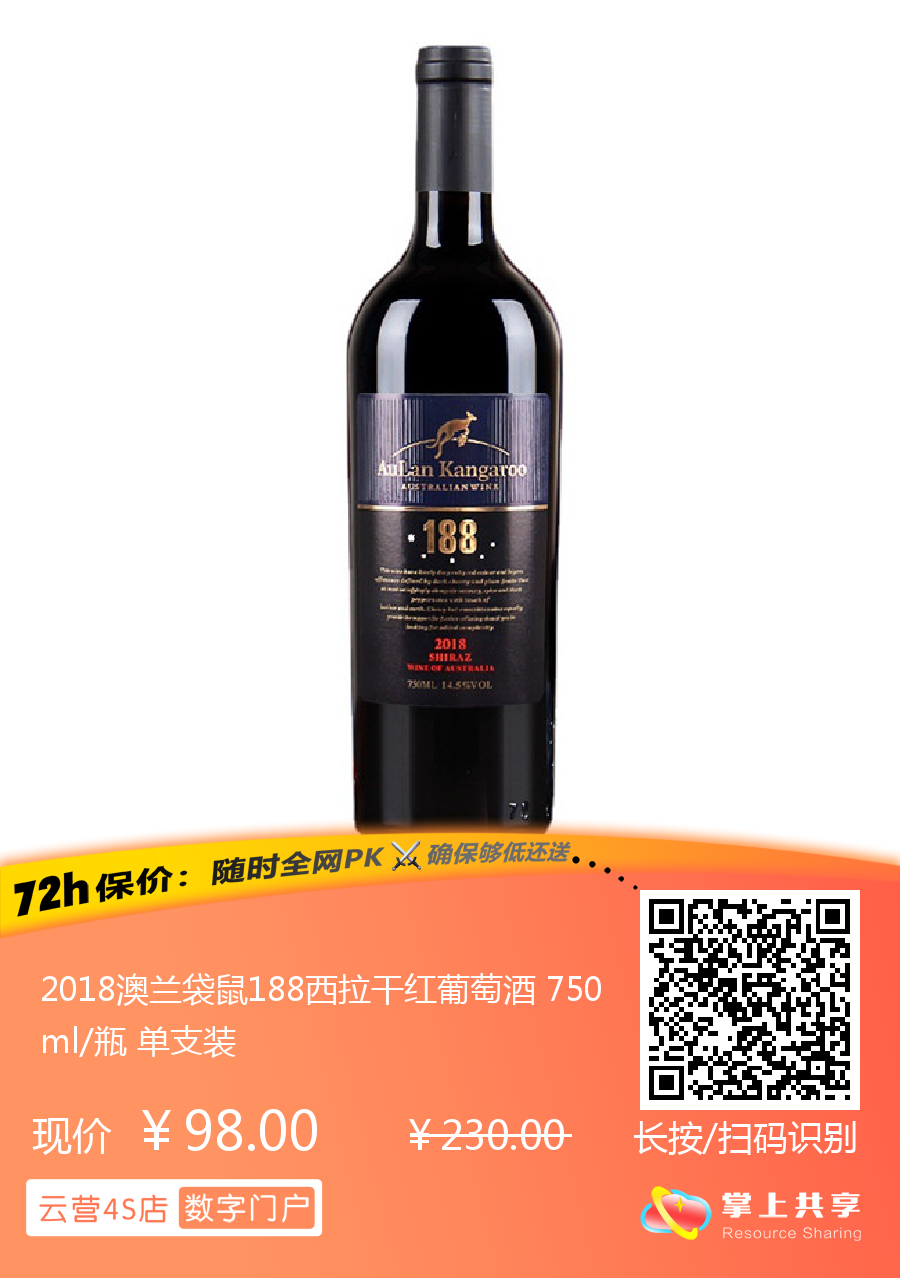 2018澳兰袋鼠188西拉干红葡萄酒 750ml/瓶 单支装