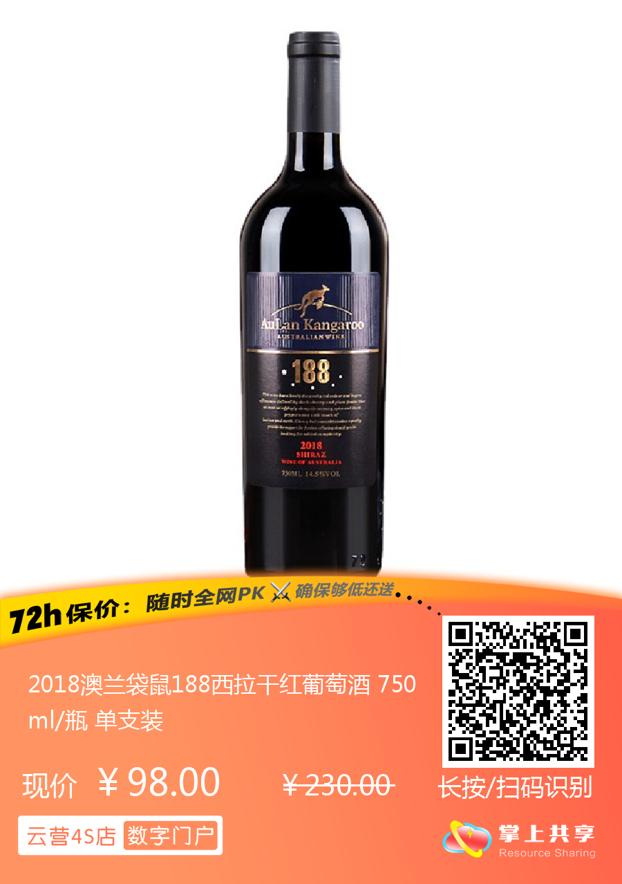 2018澳兰袋鼠188西拉干红葡萄酒 750ml/瓶 单支装