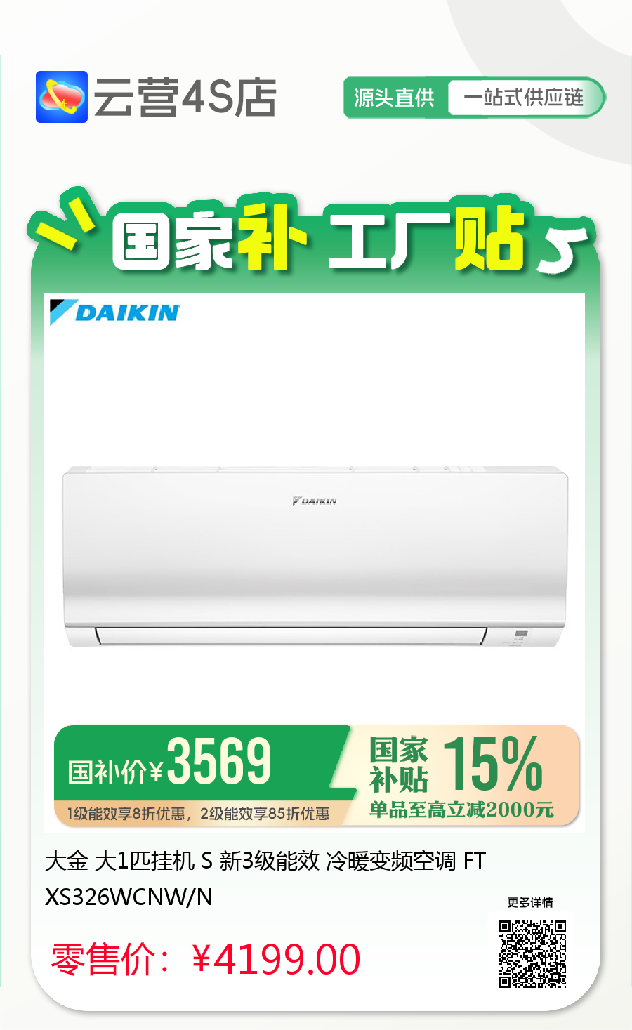 大金 大1匹挂机 S 新3级能效 冷暖变频空调 FTXS326WCNW/N