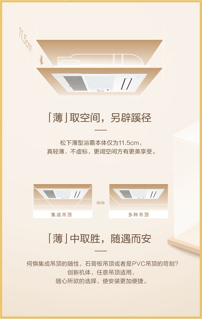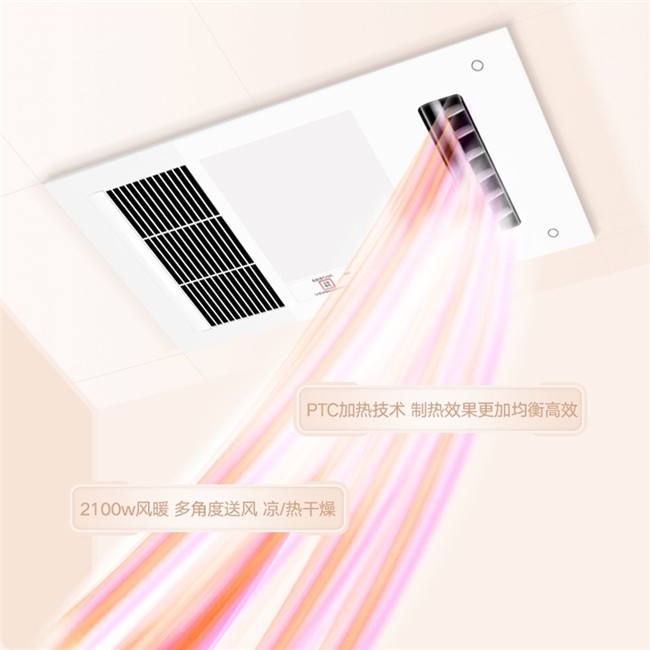 薄型浴霸本体仅11.5cm。2100w速暖,10分钟平均温度可达32℃