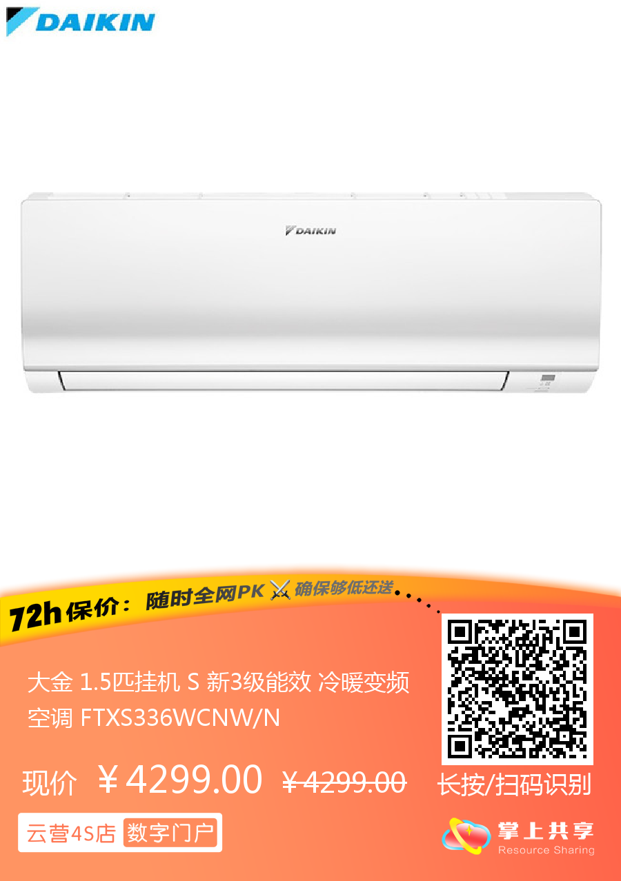 大金 1.5匹挂机 S 新3级能效 冷暖变频空调 FTXS336WCNW/N
