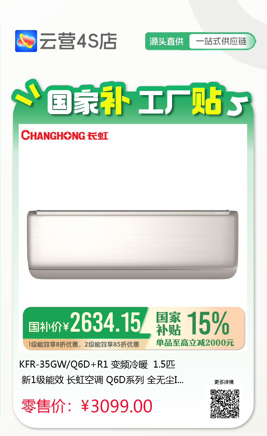 长虹 1.5匹挂机 Q6D 新1级能效 冷暖变频空调 KFR-35GW/Q6D+R1