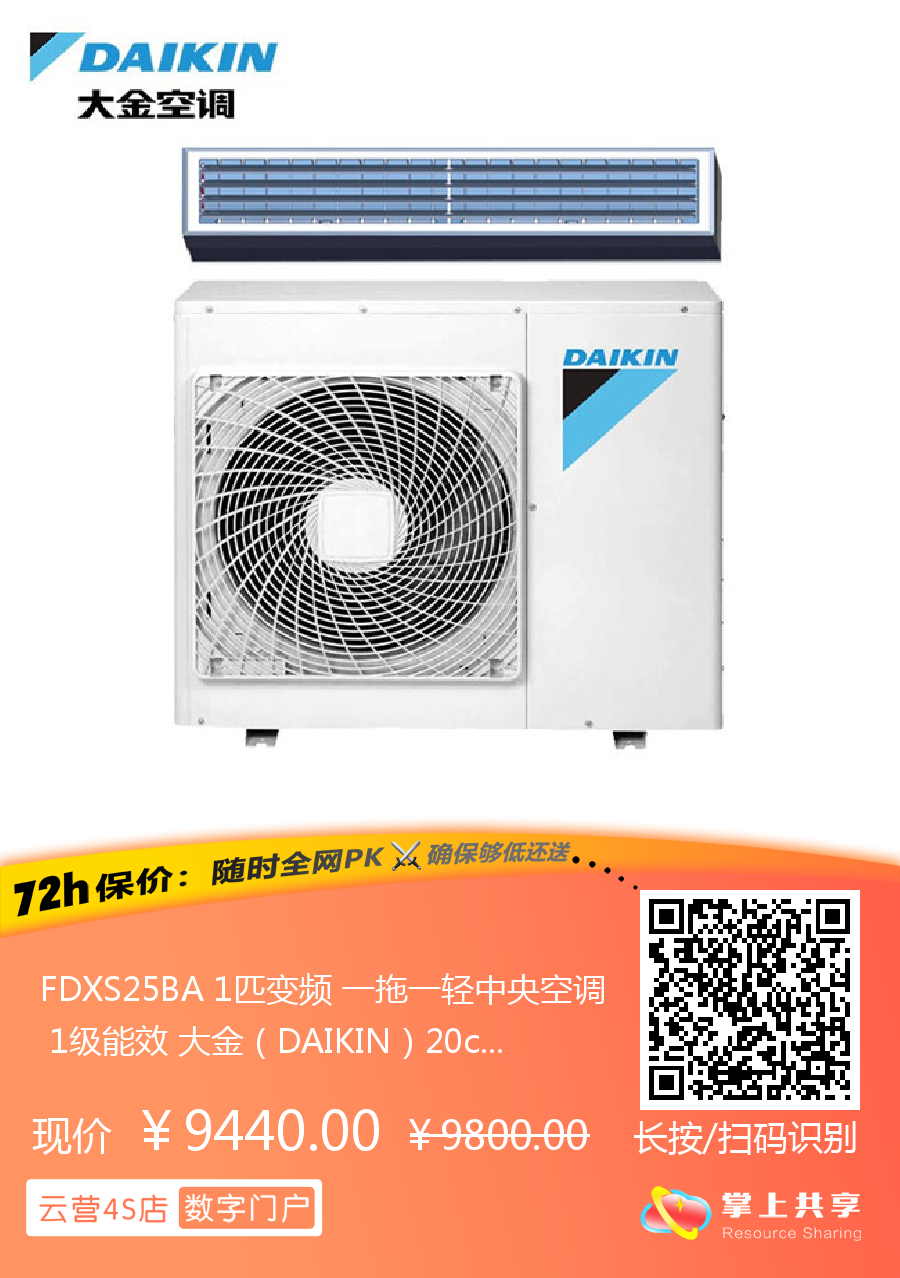 FDXS25BA 1匹变频 一拖一轻中央空调 1级能效 大金(DAIKIN)20cm超薄 遥控 带WIFI