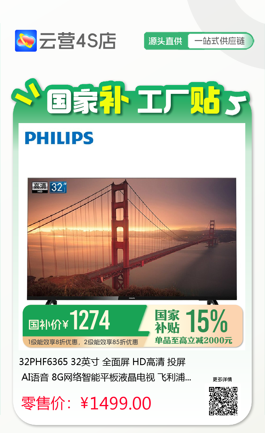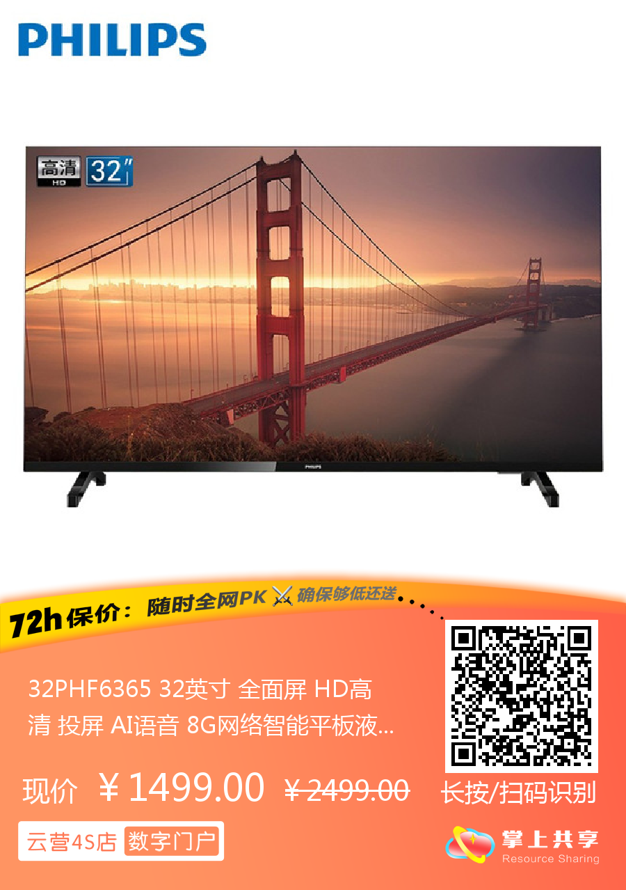 32PHF6365 32英寸 全面屏 HD高清 投屏 AI语音 8G网络智能平板液晶电视 飞利浦(PHILIPS)