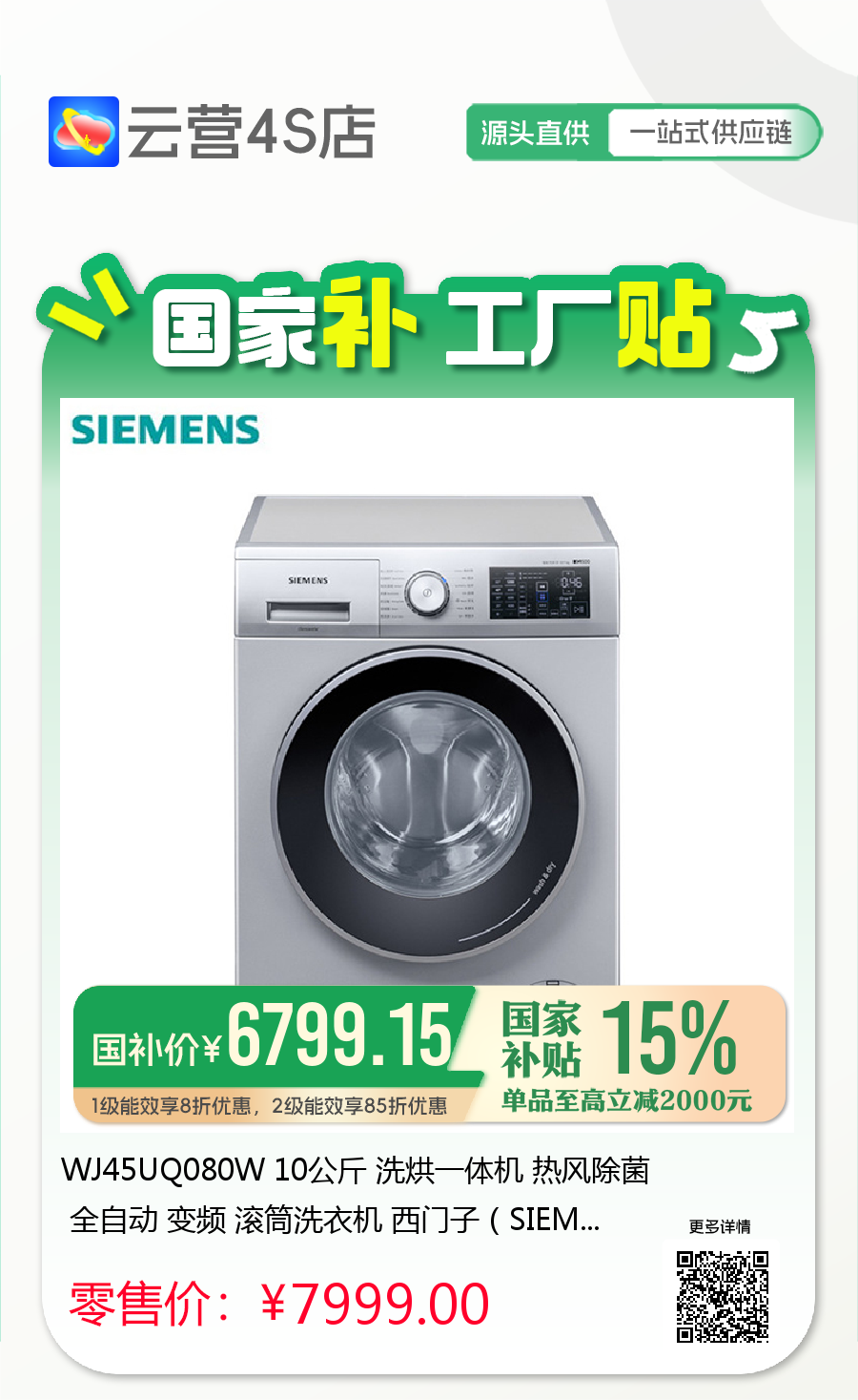 WJ45UQ080W 10公斤 洗烘一体机 热风除菌 全自动 变频 滚筒洗衣机 西门子(SIEMENS)