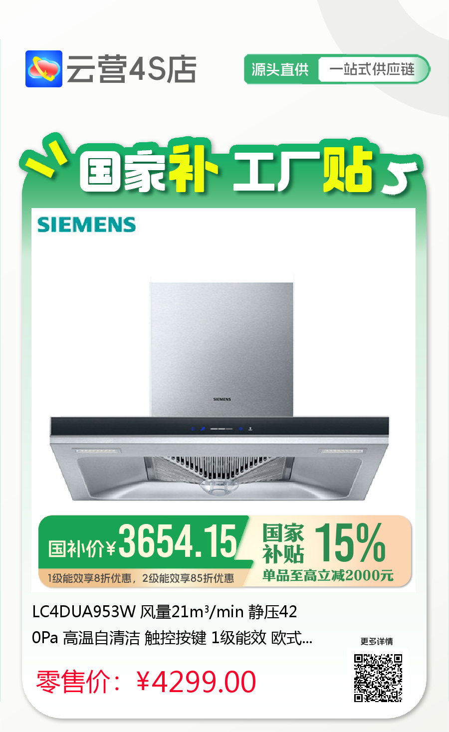 LC4DUA953W 风量21m³/min 静压420Pa 高温自清洁 触控按键 1级能效 欧式