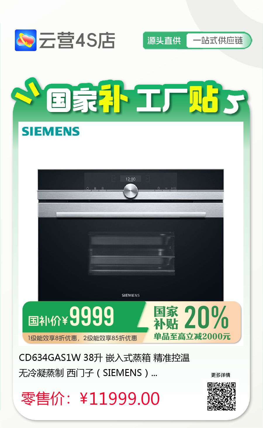 CD634GAS1W 38升 嵌入式蒸箱 精准控温 无冷凝蒸制 西门子(SIEMENS)