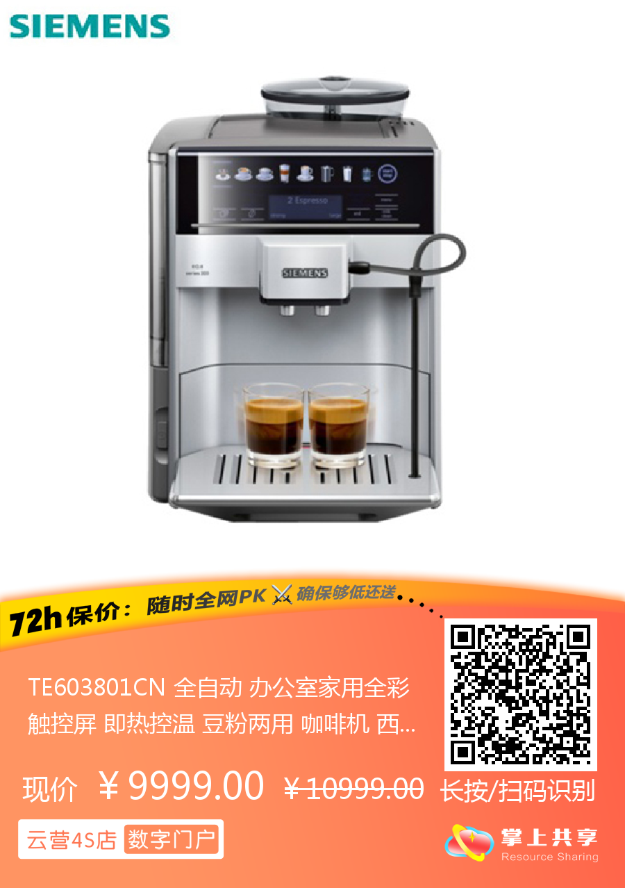 TE603801CN 全自动 办公室家用全彩触控屏 即热控温 豆粉两用 咖啡机 西门子(Siemens)