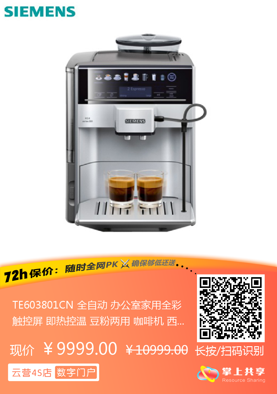 TE603801CN 全自动 办公室家用全彩触控屏 即热控温 豆粉两用 咖啡机 西门子(Siemens)