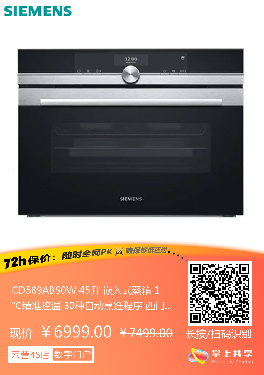 CD589ABS0W 45升 嵌入式蒸箱 1°C精准控温 30种自动烹饪程序 西门子(SIEMENS)