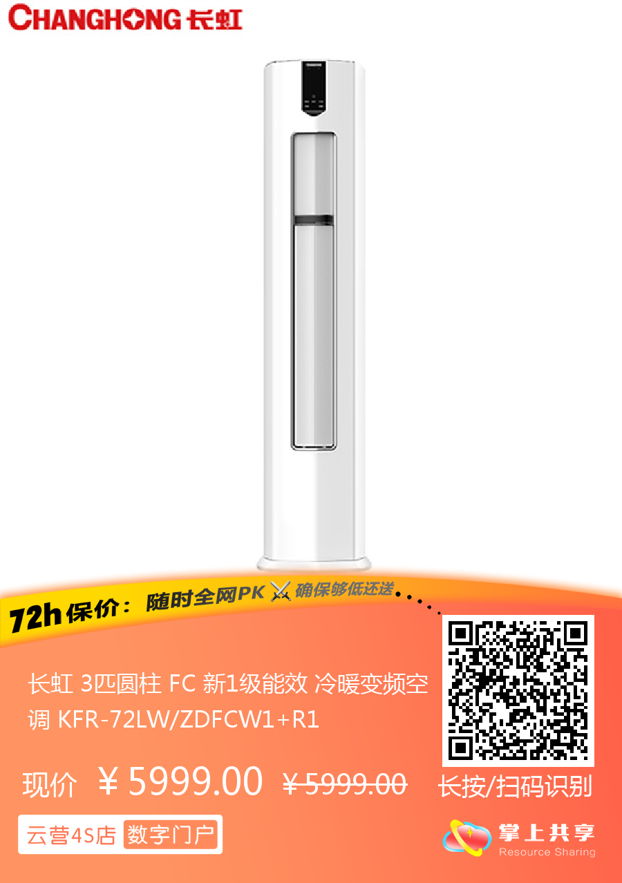 长虹 3匹圆柱 FC 新1级能效 冷暖变频空调 KFR-72LW/ZDFCW1+R1