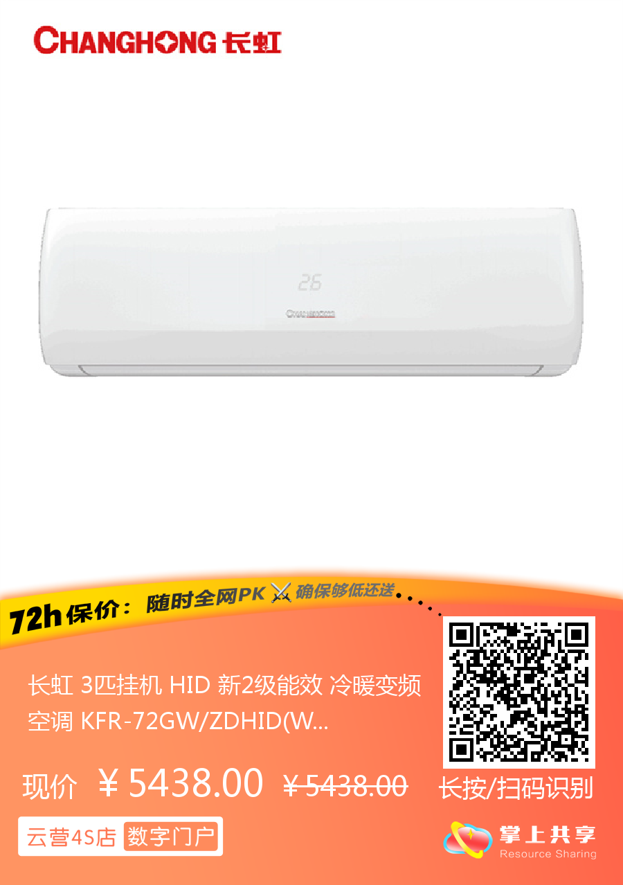 长虹 3匹挂机 HID 新2级能效 冷暖变频空调 KFR-72GW/ZDHID(W1-G)+R2
