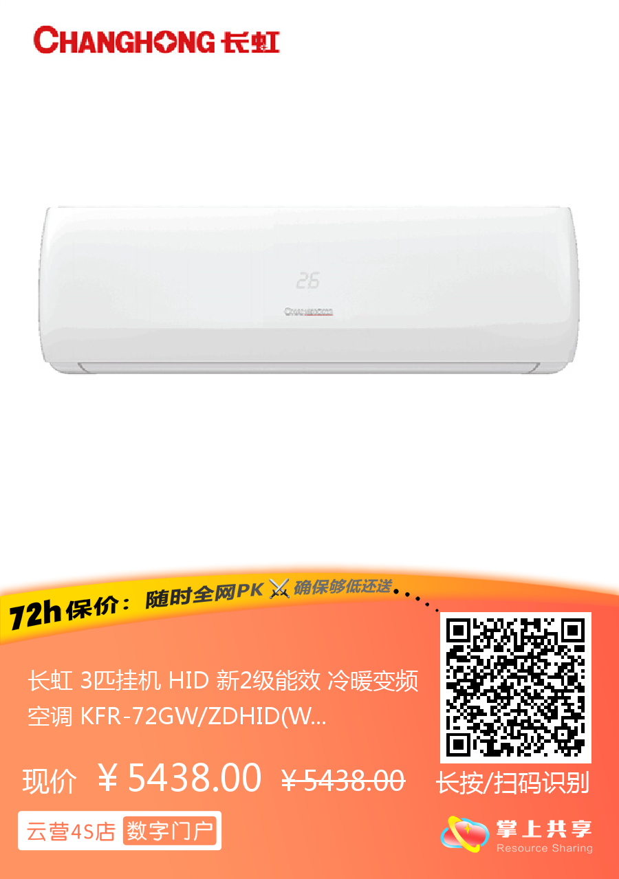 长虹 3匹挂机 HID 新2级能效 冷暖变频空调 KFR-72GW/ZDHID(W1-G)+R2