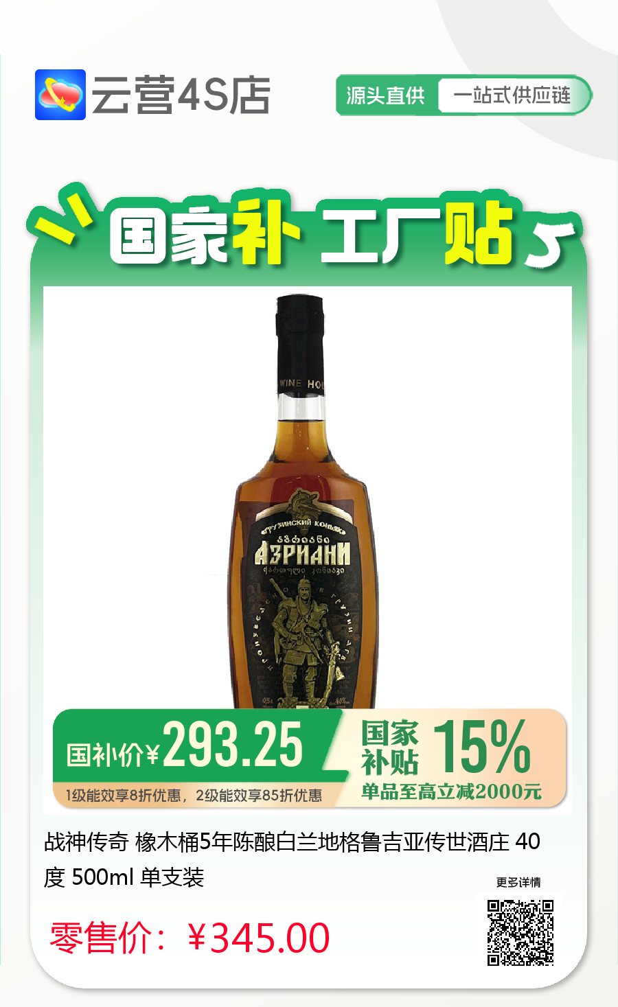 战神传奇 橡木桶5年陈酿白兰地格鲁吉亚传世酒庄 40度 500ml 单支装
