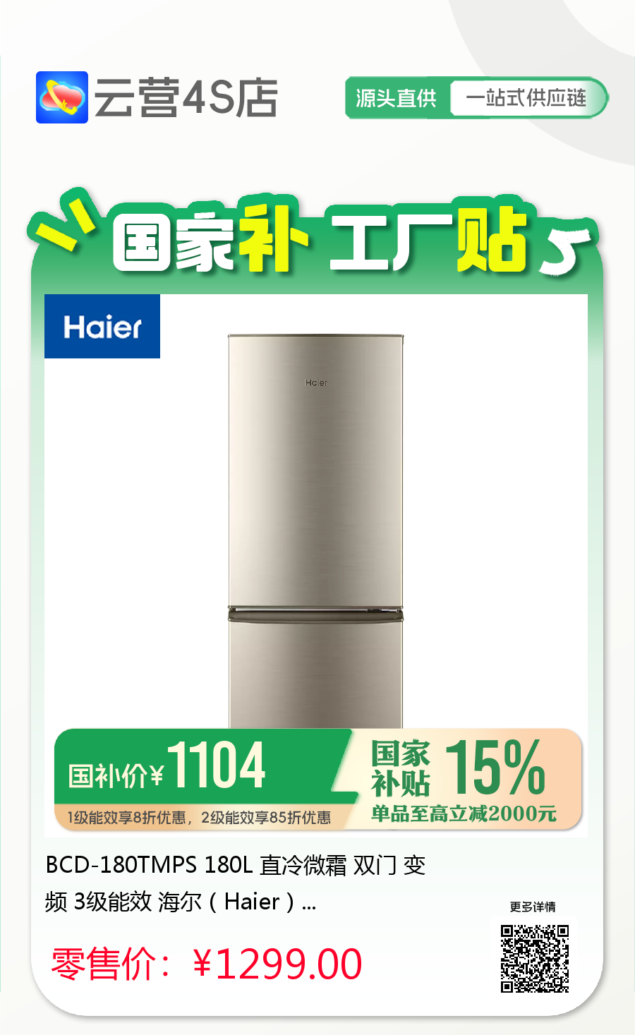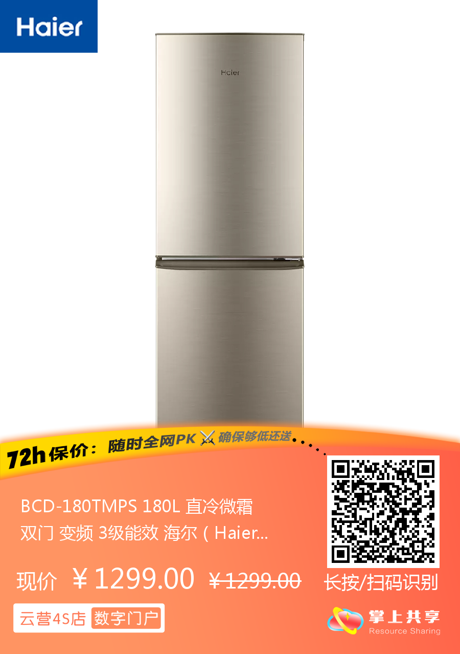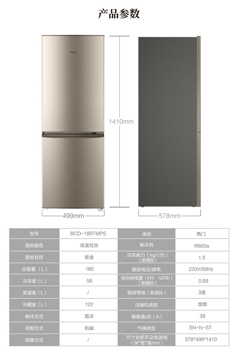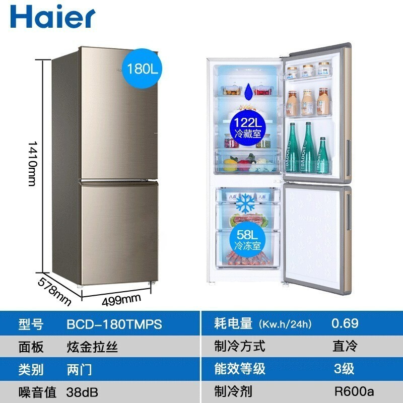 BCD-180TMPS 180L 直冷微霜 双门 变频 3级能效 海尔(Haier)