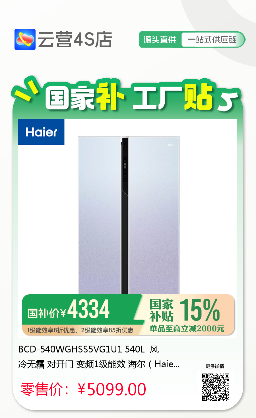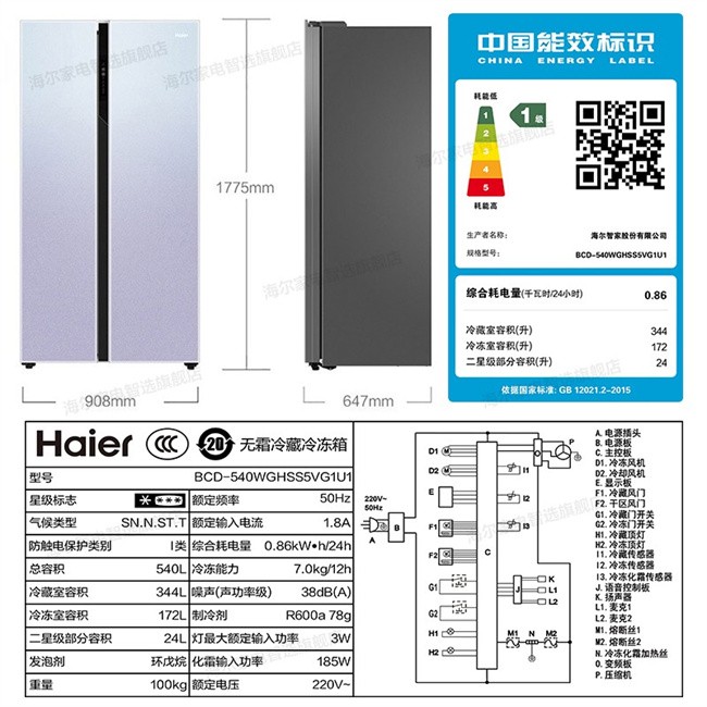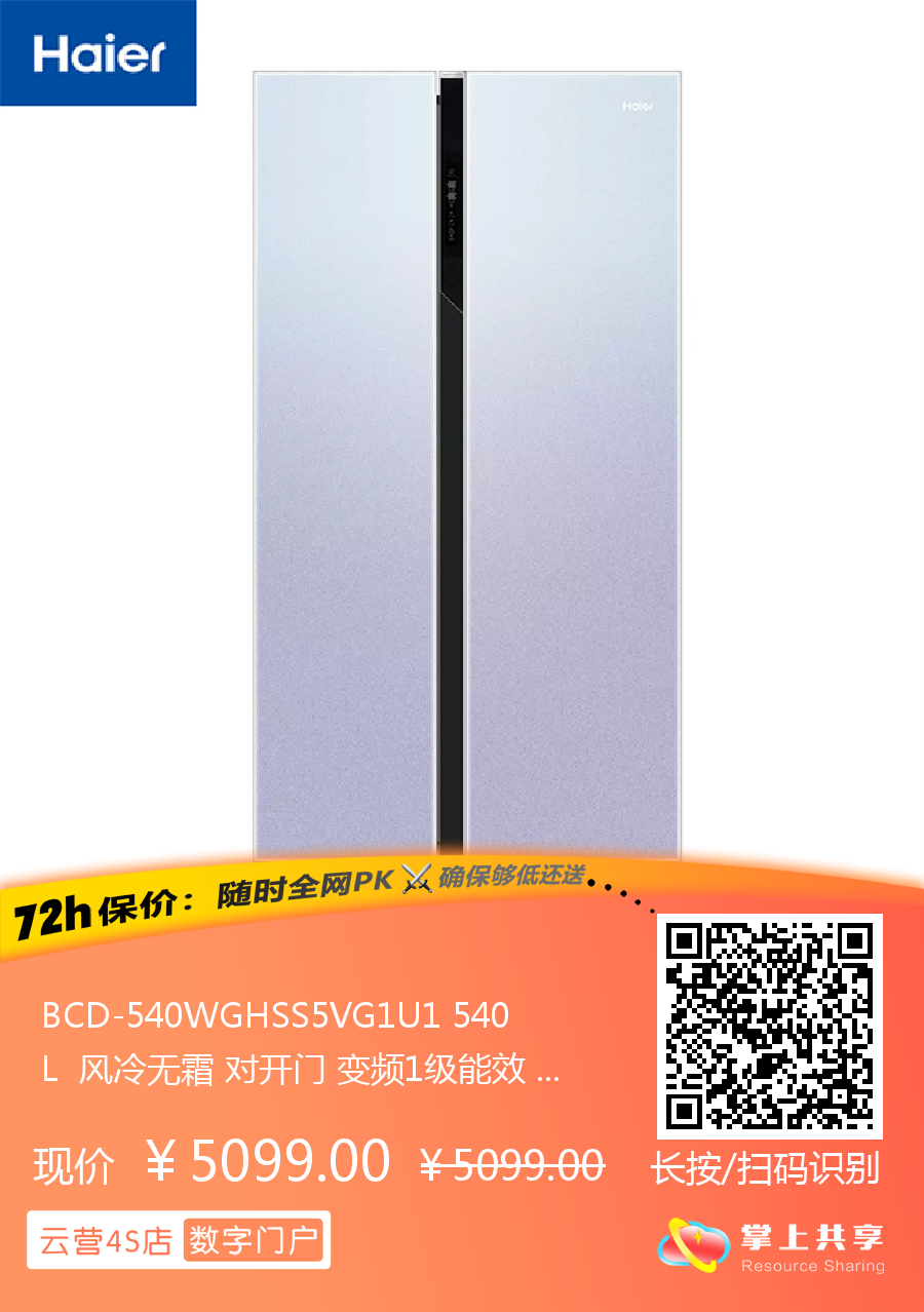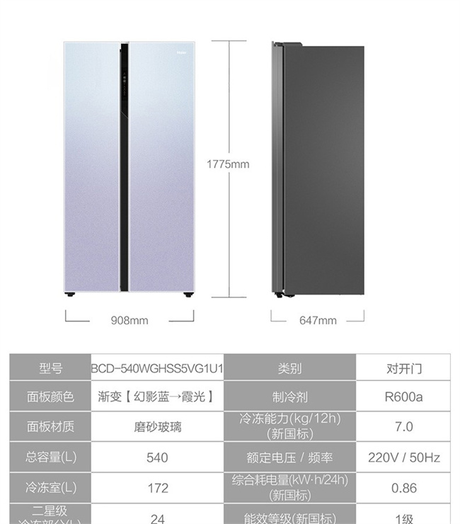 BCD-540WGHSS5VG1U1 540L 风冷无霜 对开门 变频1级能效 海尔(Haier)