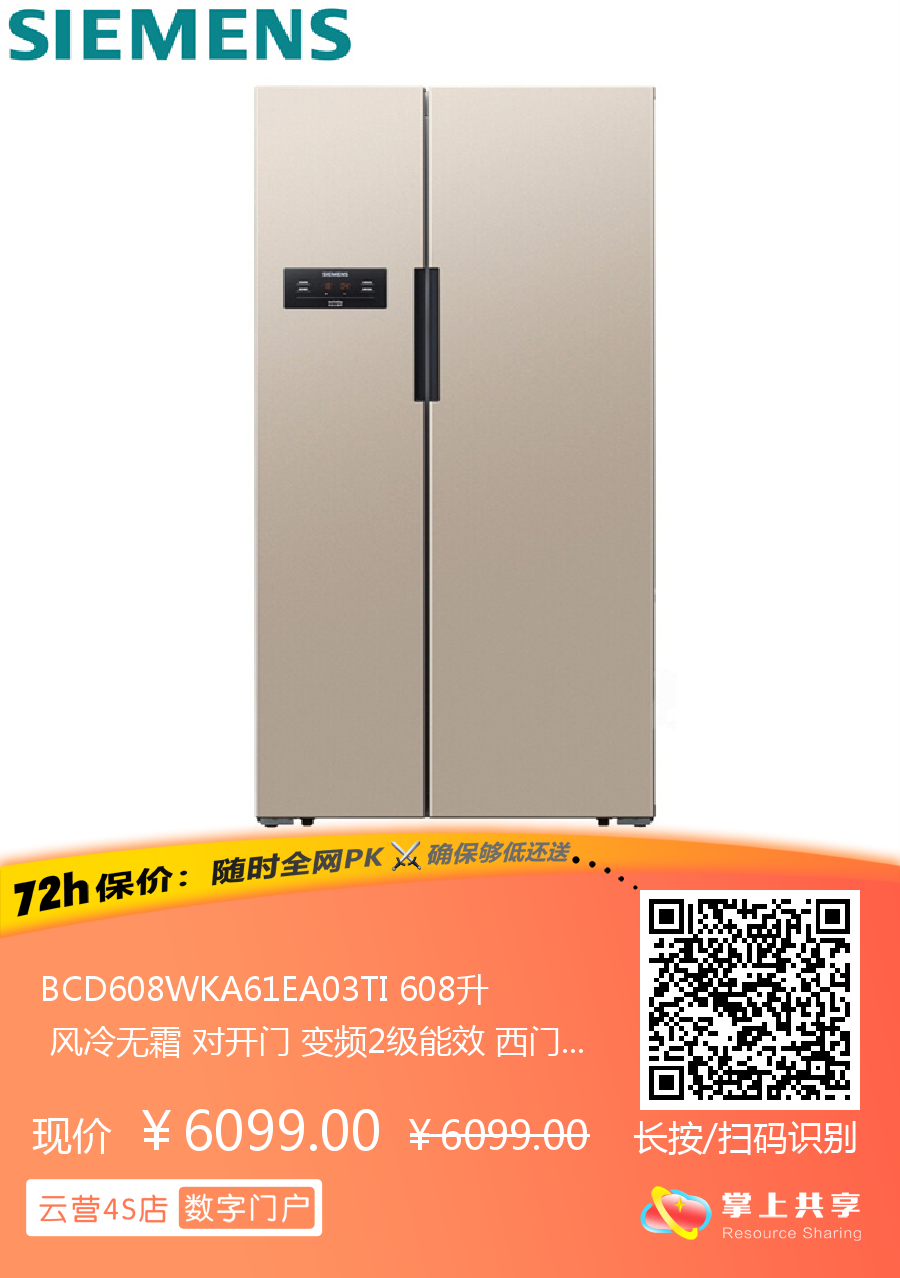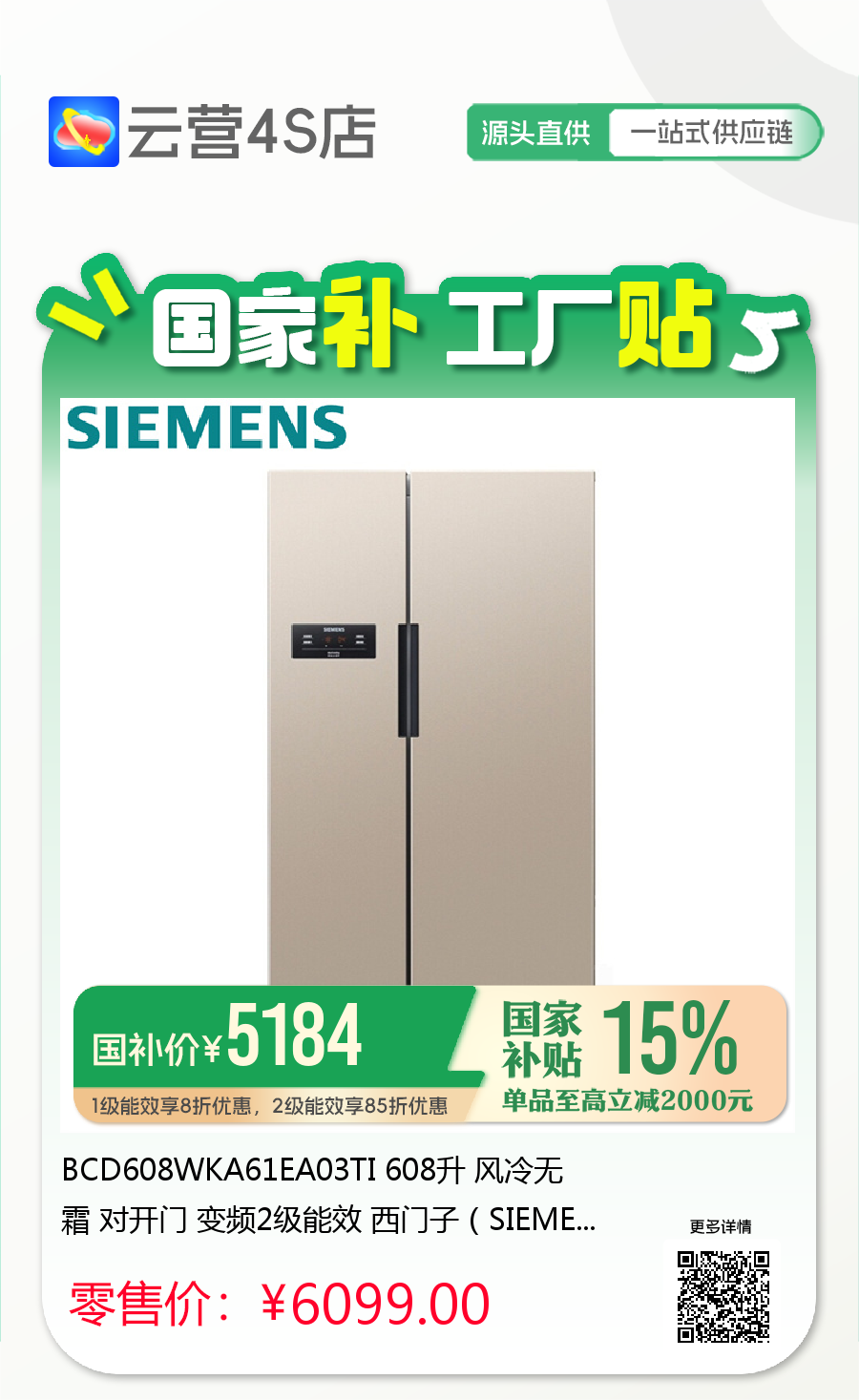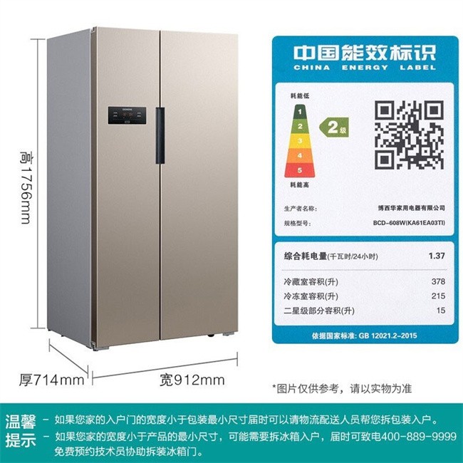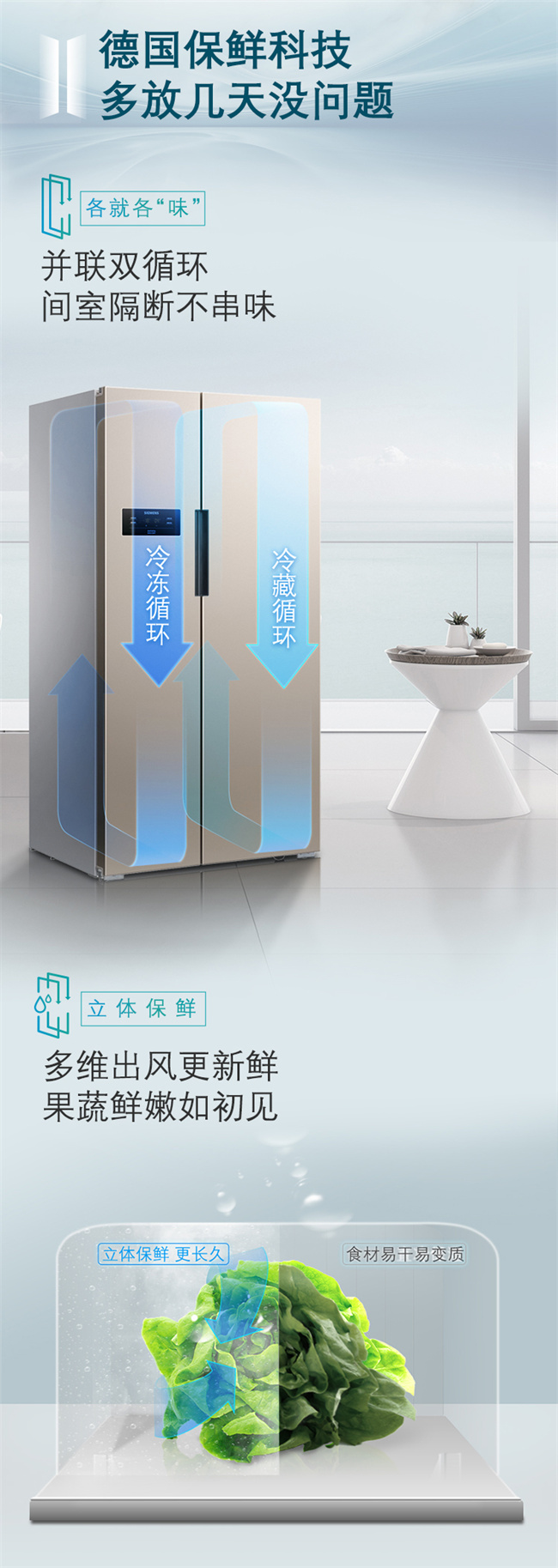 BCD608WKA61EA03TI 608升 风冷无霜 对开门 变频2级能效 西门子(SIEMENS)