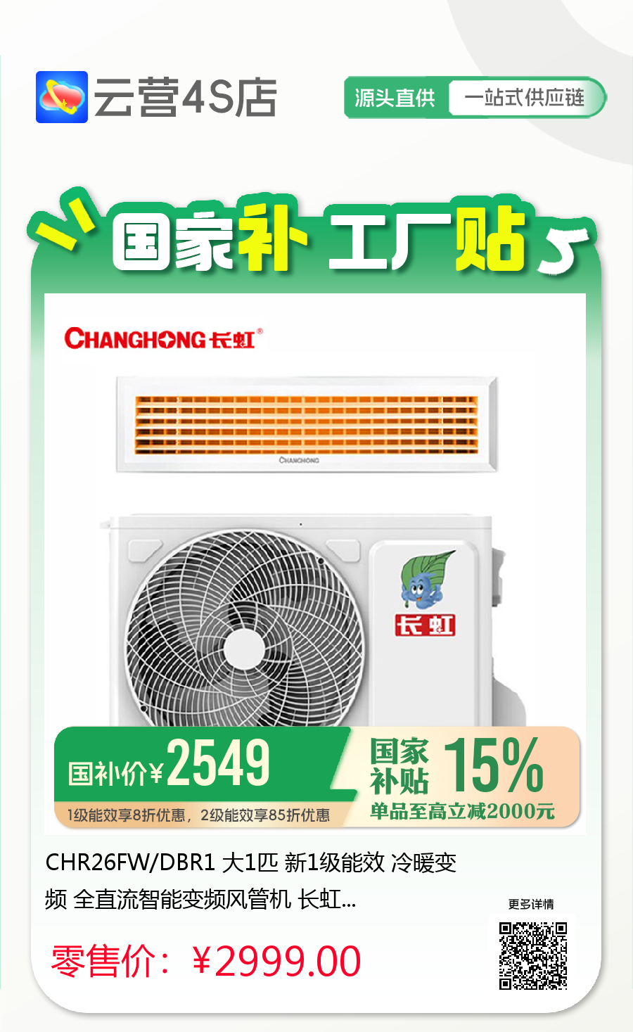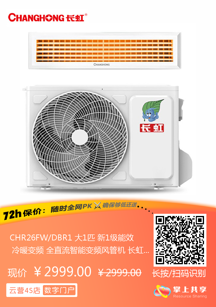 CHR26FW/DBR1 大1匹 新1级能效 冷暖变频 全直流智能变频风管机 长虹