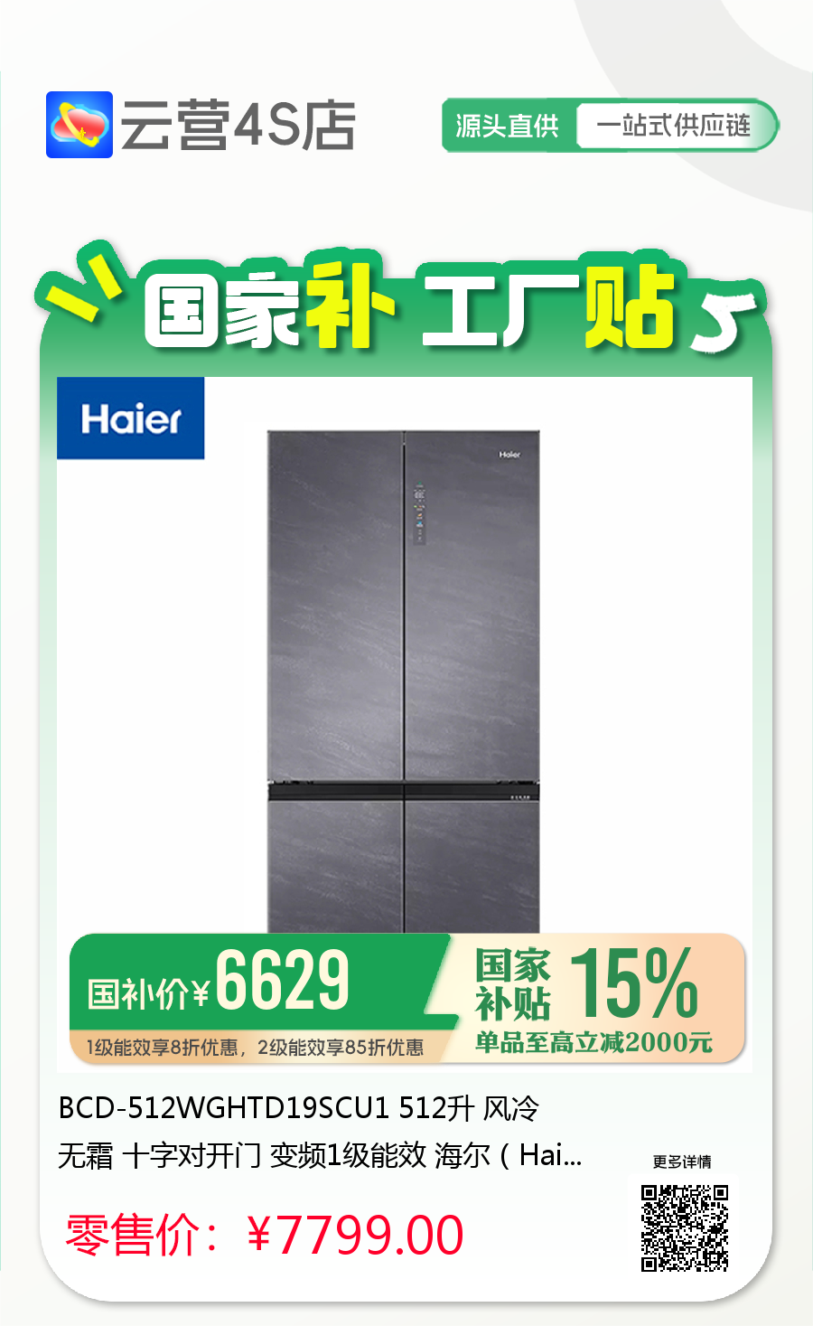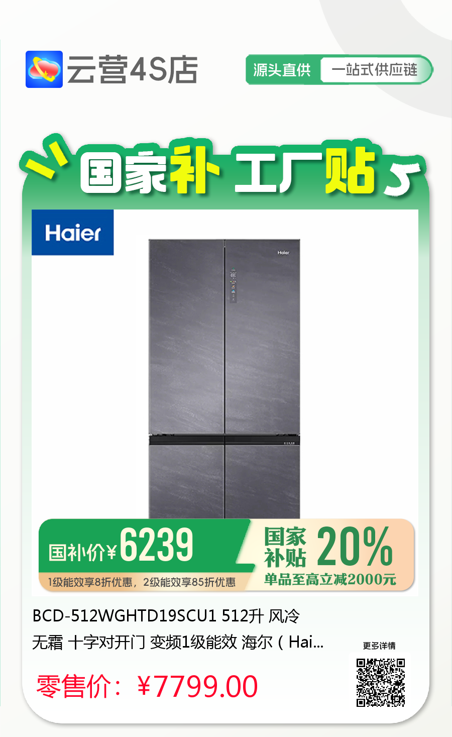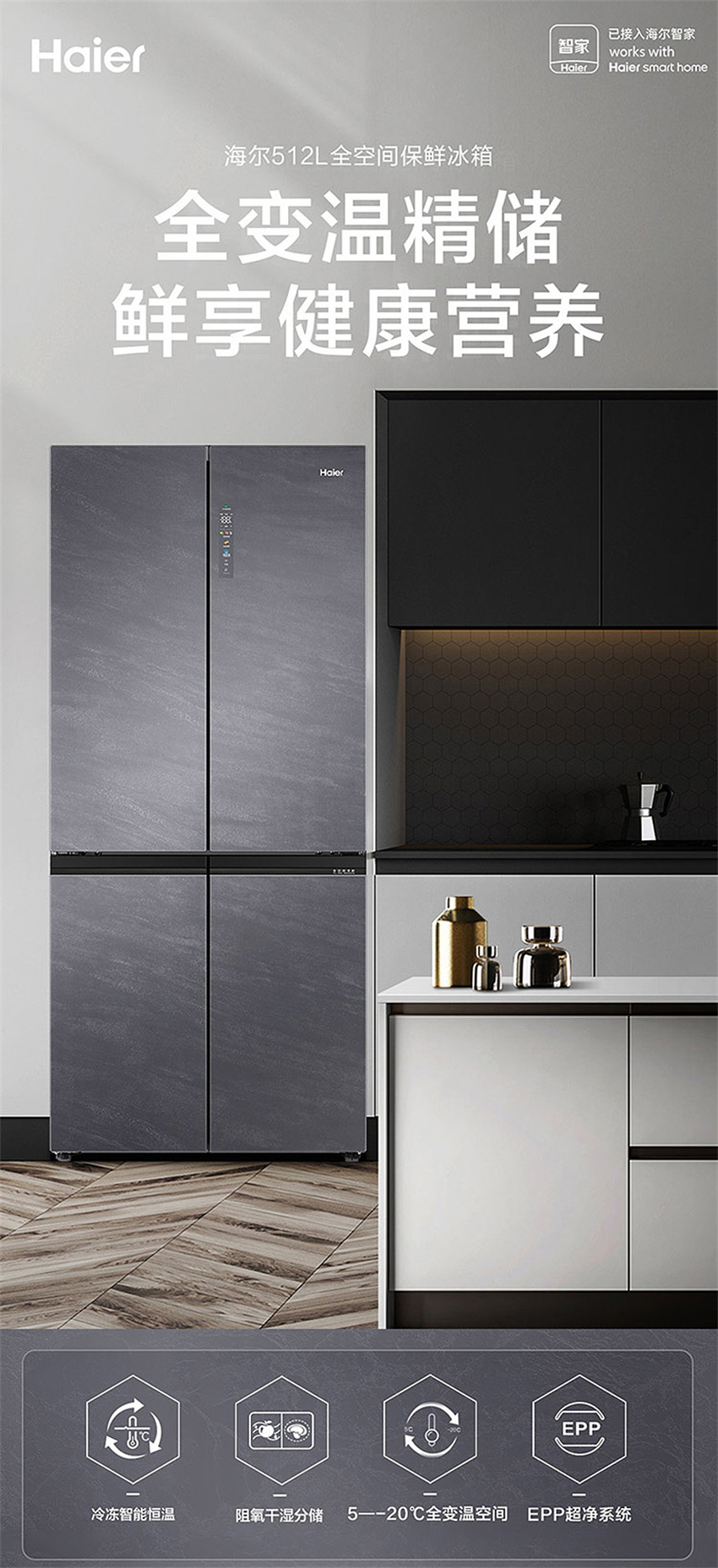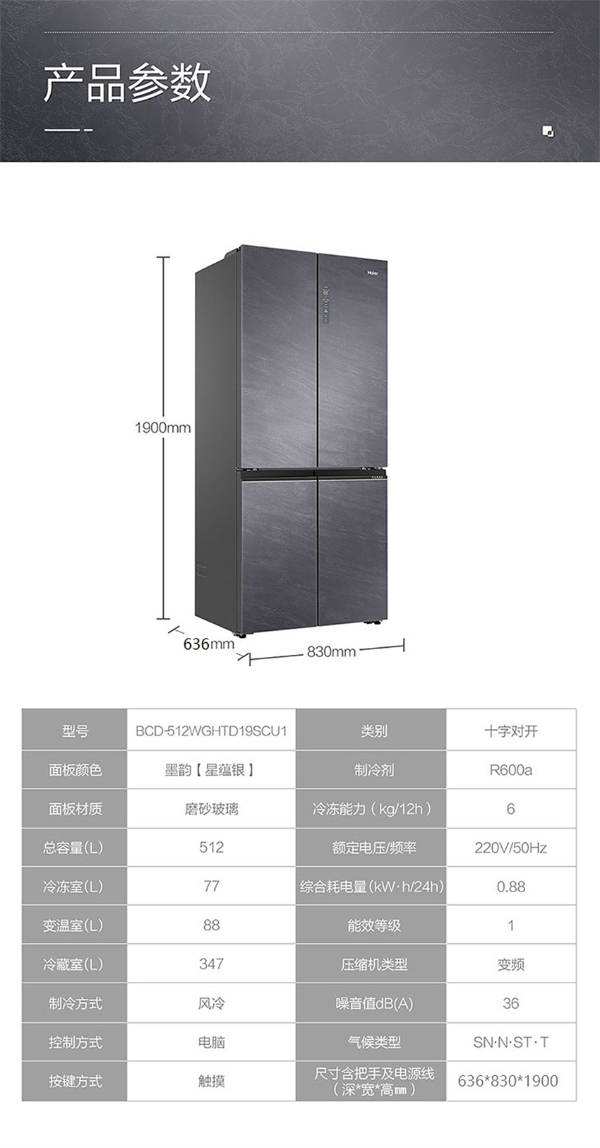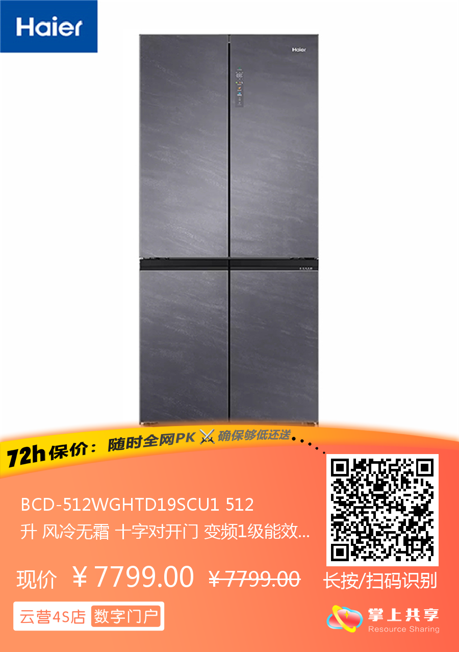 BCD-512WGHTD19SCU1 512升 风冷无霜 十字对开门 变频1级能效 海尔(Haier)