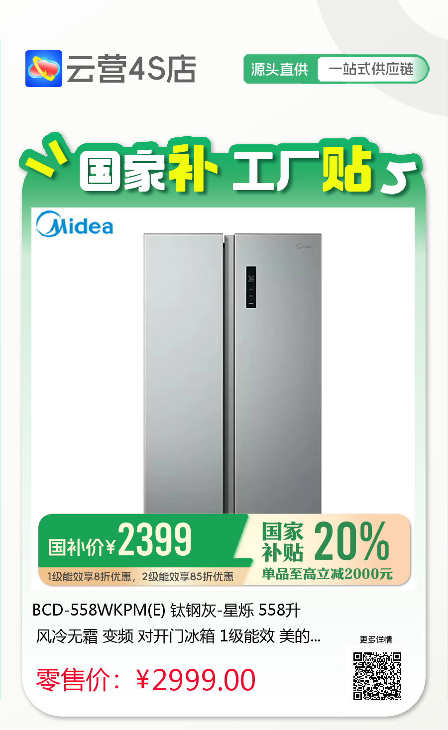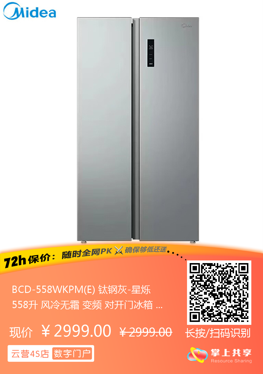 BCD-558WKPM(E) 钛钢灰-星烁 558升 风冷无霜 变频 对开门冰箱 1级能效 美的(Midea)