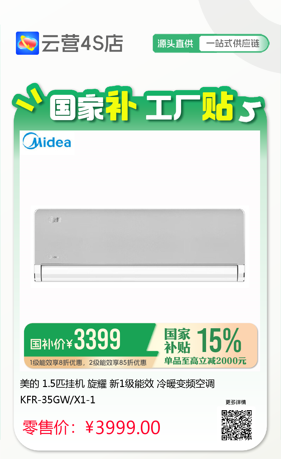 美的 1.5匹挂机 旋耀 新1级能效 冷暖变频空调 KFR-35GW/X1-1
